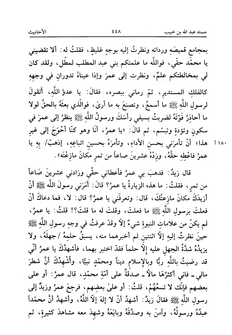 بِمَجَامِع قميصة وردانه وَنَظَرْتُ إِلَيْهِ بِوَجْهٍ غَلِيظٍ فَقُلْتُ لَهُ أَلا تَقْضِينِي يَا مُحَمَّدُ حَقِّي فَوَاللَّهِ مَا عَلِمْتُكُمْ بَنِي عَبْدِ الْمُطَّلِبِ لِمَطْلٍ وَلَقَدْ كَانَ لِي لِمُخَالَطَتِكُمْ عِلْمٌ وَنَظَرْتُ إِلَى عُمَرَ وَإِذَا عَيْنَاهُ تَدُورَانِ فِي وَجْهِهِ كَالْفَلَكِ الْمُسْتَدِيرِ ثُمَّ رَمَانِي بِبَصَرِهِ فَقَالَ يَا عَدُوَّ اللَّهِ أَتَقُولُ لِرَسُولِ اللَّهِ صَلَّى اللَّهُ عَلَيْهِ وَسَلَّمَ مَا أَسْمَعُ وَتَصْنَعُ بِهِ مَا أَرَى فَوَالَّذِي بَعَثَهُ بِالْحَقِّ لَوْلا مَا أُحَاذِرُ فَوْتَهُ لَضَرَبْتُ بِسَيْفِي رَأْسِكَ وَرَسُولُ اللَّهِ صَلَّى اللَّهُ عَلَيْهِ وَسَلَّمَ يَنْظُرُ إِلَى عُمَرَ فِي سُكُونٍ وَتُؤَدَةٍ وَتَبَسُّمٍ ثُمَّ قَالَ يَا عُمَرُ أَنَا وَهُوَ كُنَّا أَحْوَجَ إِلَى غَيْرِ هَذَا أَنْ تَأْمُرَنِي بِحُسْنِ الأَدَاءِ وتأمره بِحُسَيْن اتِّبَاعه اذهبه يَا عُمَرُ فَأَعْطِهِ حَقَّهُ وَزِدْهُ عِشْرِينَ صَاعًا من تمر مَكَان مازعته قَالَ زَيْدٌ فَذَهَبَ بِي عُمَرُ فَأَعْطَانِي حَقِّي وَزَادَنِي عِشْرِينَ صَاعًا مِنْ تَمْرٍ فَقُلْتُ مَا هَذِه الزياره يَا عُمَرُ قَالَ أَمَرَنِي رَسُولُ اللَّهِ صَلَّى الله عَلَيْهِ وَسلم أَن أزيدك مَكَان مازعتك قَالَ وَتَعْرِفُنِي يَا عُمَرُ قَالَ لَا فَمَا دَعَاكَ أَنْ فَعَلْتَ بِرَسُولِ اللَّهِ صَلَّى اللَّهُ عَلَيْهِ وَسَلَّمَ مَا فَعَلْتَ وَقُلْتَ لَهُ مَا قُلْتَ قُلْتُ يَا عُمَرُ لَمْ يَكُنْ مِنْ عَلامَاتِ النُّبُوَّةِ شَيْءٌ إِلا وَقَدْ عَرَفْتُ فِي وَجْهُ رَسُولِ اللَّهِ صَلَّى اللَّه عَلَيْهِ وَسَلَّمَ حِينَ نَظَرْتُ إِلَيْهِ إِلا اثْنَتَيْنِ لَمْ أُخْبَرْهُمَا مِنْهُ يَسْبِقُ حِلْمُهُ جَهْلَهُ وَلا يَزِيدُهُ شِدَّةُ الْجَهْلِ عَلَيْهِ إِلا حِلْمًا فَقَدِ اخْتُبِرَ بِهِمَا فَأُشْهِدُكَ يَا عُمَرُ أَنِّي قَدْ رَضِيتُ بِاللَّهِ رَبًّا وَبِالإِسْلامِ دِينًا وَمُحَمَّدٍ نَبِيًّا وَأُشْهِدُكَ أَنَّ شَطْرَ مَالِي فَإِنِّي أَكْثَرُهَا مَالا صَدَقَةٌ عَلَى أُمَّةِ مُحَمَّدٍ قَالَ عُمَرُ أَوْ عَلَى بَعْضِهِمْ فانك لَا تسعهم قلت أوعلى بَعْضِهِمْ فَرَجَعَ عُمَرُ وَزَيْدٌ إِلَى رَسُولِ اللَّهِ صَلَّى اللَّهُ عَلَيْهِ وَسَلَّمَ فَقَالَ زَيْدٌ أَشْهَدُ أَنْ لَا إِلَهَ إِلا اللَّهُ وَأَشْهَدُ أَنَّ مُحَمَّدًا عَبده وَرَسُوله وآمن بن وَصَدَّقَهُ وَبَايَعَهُ وَشَهِدَ مَعَهُ مَشَاهِدَ كَثِيرَةً ثُمَّ