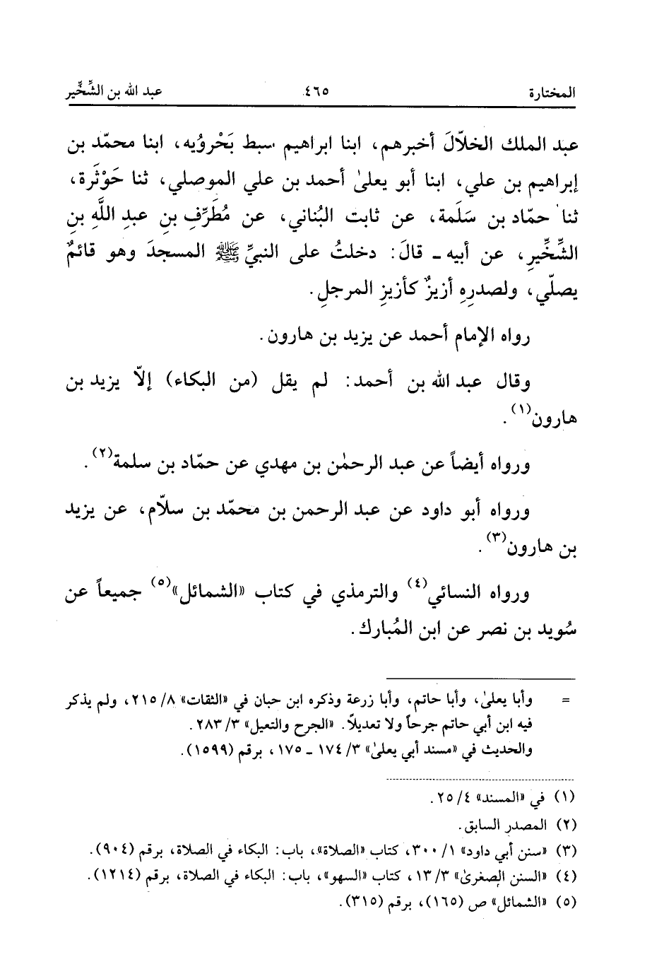 رَوَاهُ الإِمَامُ أَحْمَدُ عَنْ يَزِيدَ بْنِ هَارُونَ وَقَالَ عَبْدُ اللَّهِ بْنُ أَحْمَدَ لَمْ يَقُلْ (مِنَ الْبُكَاءِ) إِلا يَزِيدَ بْنَ هَارُونَ وَرَوَاهُ أَيْضًا عَنْ عَبْدِ الرَّحْمَنِ بْنِ مَهْدِيٍّ عَنْ حَمَّادِ بْنِ سَلَمَةَ وَرَوَاهُ أَبُو دَاوُدَ عَنْ عَبْدِ الرَّحْمَنِ بْنِ مُحَمَّدِ بْنِ سَلامٍ عَنْ يَزِيدَ بْنِ هَارُونَ وَرَوَاهُ النَّسَائِيُّ وَالتِّرْمِذِيُّ فِي كِتَابِ (الشَّمَائِلِ) جَمِيعًا عَنْ سُوَيْدِ بْنِ نصر عَن ابْن المارك