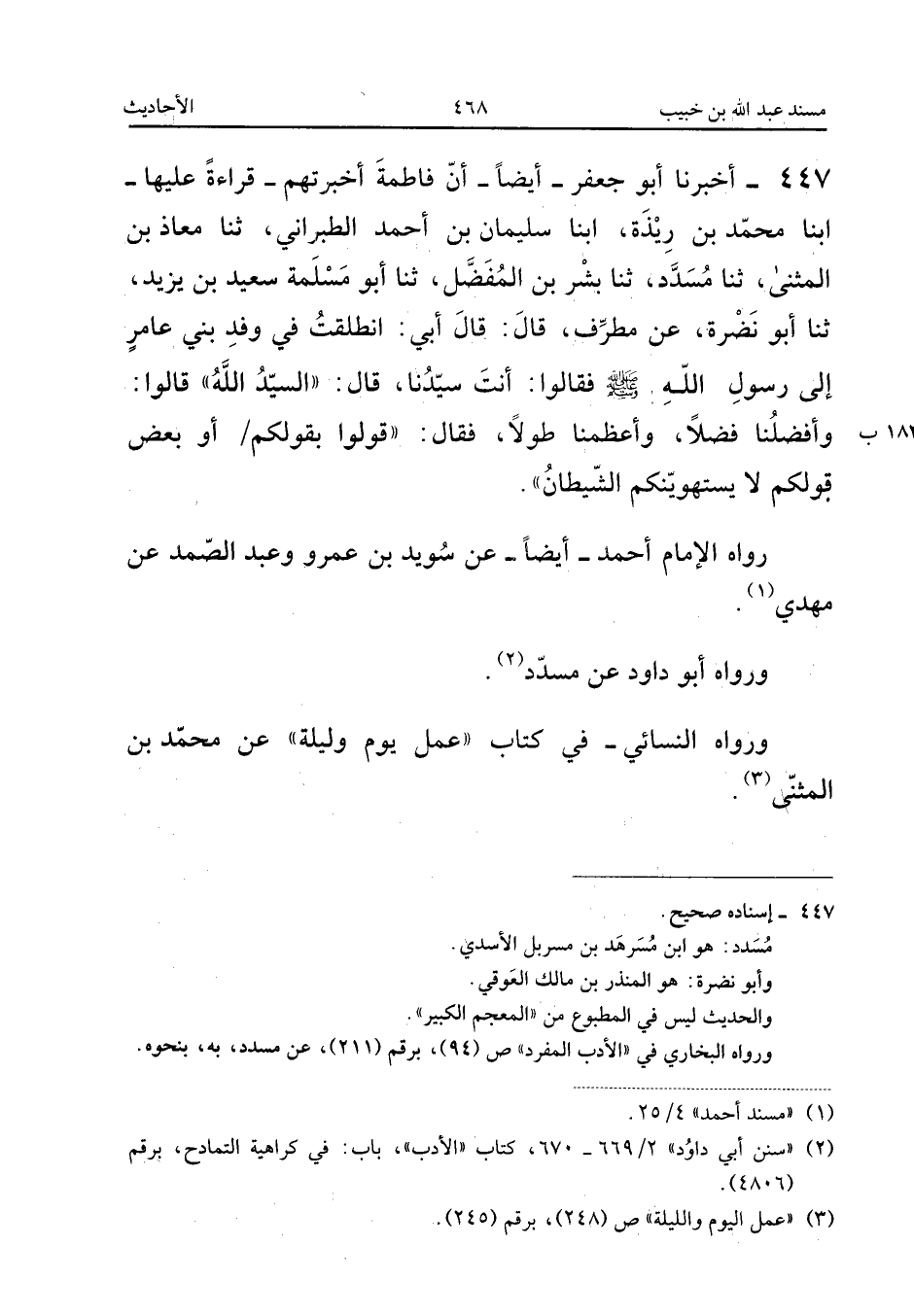 447 - أَخْبَرَنَا أَبُو جَعْفَرٍ أَيْضًا أَنَّ فَاطِمَةَ أَخْبَرَتْهُمْ قِرَاءَةً عَلَيْهَا أبنا مُحَمَّدُ بْنُ رِيذَةَ أبنا سُلَيْمَانُ بْنُ أَحَمَدَ الطَّبَرَانِيُّ ثَنَا مُعَاذُ بْنُ الْمُثَنَّى ثَنَا مُسَدَّدٌ ثَنَا بِشْرُ بْنُ الْمُفَضَّلِ ثَنَا أَبُو مَسْلَمَةَ سَعِيدُ بْنُ يَزِيدَ ثَنَا أَبُو نَضْرَةَ عَنْ مُطَرِّفٍ قَالَ قَالَ أَبِي انْطَلَقْتُ فِي وَفْدِ بَنِي عَامِرٍ إِلَى رَسُولِ اللَّهِ صَلَّى اللَّهُ عَلَيْهِ وَسَلَّمَ فَقَالُوا أَنْتَ سَيِّدُنَا قَالَ السَّيِّدُ اللَّهُ قَالُوا وَأَفْضَلُنَا فَضْلا وَأَعْظَمُنَا طَوْلا فَقَالَ قُولُوا بِقَوْلِكُمْ أَوْ بَعْضِ قَوْلِكُمْ لَا يَسْتَهْوِيَنَّكُمُ الشَّيْطَانُ
