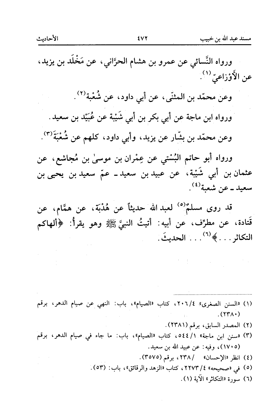 وَرَوَاهُ النَّسَائِيُّ عَنْ عَمْرِو بْنِ هِشَامٍ الْحَرَّانِيِّ عَنْ مَخْلَدِ بْنِ يَزِيدَ عَنِ الأَوْزَاعِيِّ وَعَنْ مُحَمَّدِ بْنِ الْمُثَنَّى عَنْ أَبِي دَاوُدَ عَنْ شُعْبَةَ وَرَوَاهُ ابْنُ مَاجَهْ عَنْ أَبِي بَكْرِ بْنِ أَبِي شَيْبَةَ عَنْ عُبَيْدِ بْنِ سَعِيدٍ وَعَنْ مُحَمَّدِ بْنِ بَشَّارٍ عَنْ يَزِيدَ وَأَبِي دَاوُدَ كُلُّهُمْ عَنْ شُعْبَةَ وَرَوَاهُ أَبُو حَاتِمٍ الْبُسْتِيُّ عَنْ عِمْرَانَ بْنِ مُوسَى بْنِ مُجَاشِعٍ عَنْ عُثْمَانَ بْنِ أَبِي شَيْبَةَ عَنْ عُبَيْدِ بْنِ سَعِيدٍ عَمِّ سَعِيدِ بْنِ يَحْيَى بْنِ سَعِيدٍ عَنْ شُعْبَةَ قَدْ رَوَى مُسْلِمٌ لِعَبْدِ اللَّهِ حَدِيثًا عَنْ هُدْبَةَ عَنْ هَمَّامٍ عَنْ قَتَادَةَ عَنْ مُطَرِّفٍ عَنْ أَبِيهِ أَتَيْتُ النَّبِيَّ صَلَّى اللَّهُ عَلَيْهِ وَسَلَّمَ وَهُوَ يَقْرَأُ أَلْهَاكُمُ التكاثر {الحَدِيث}