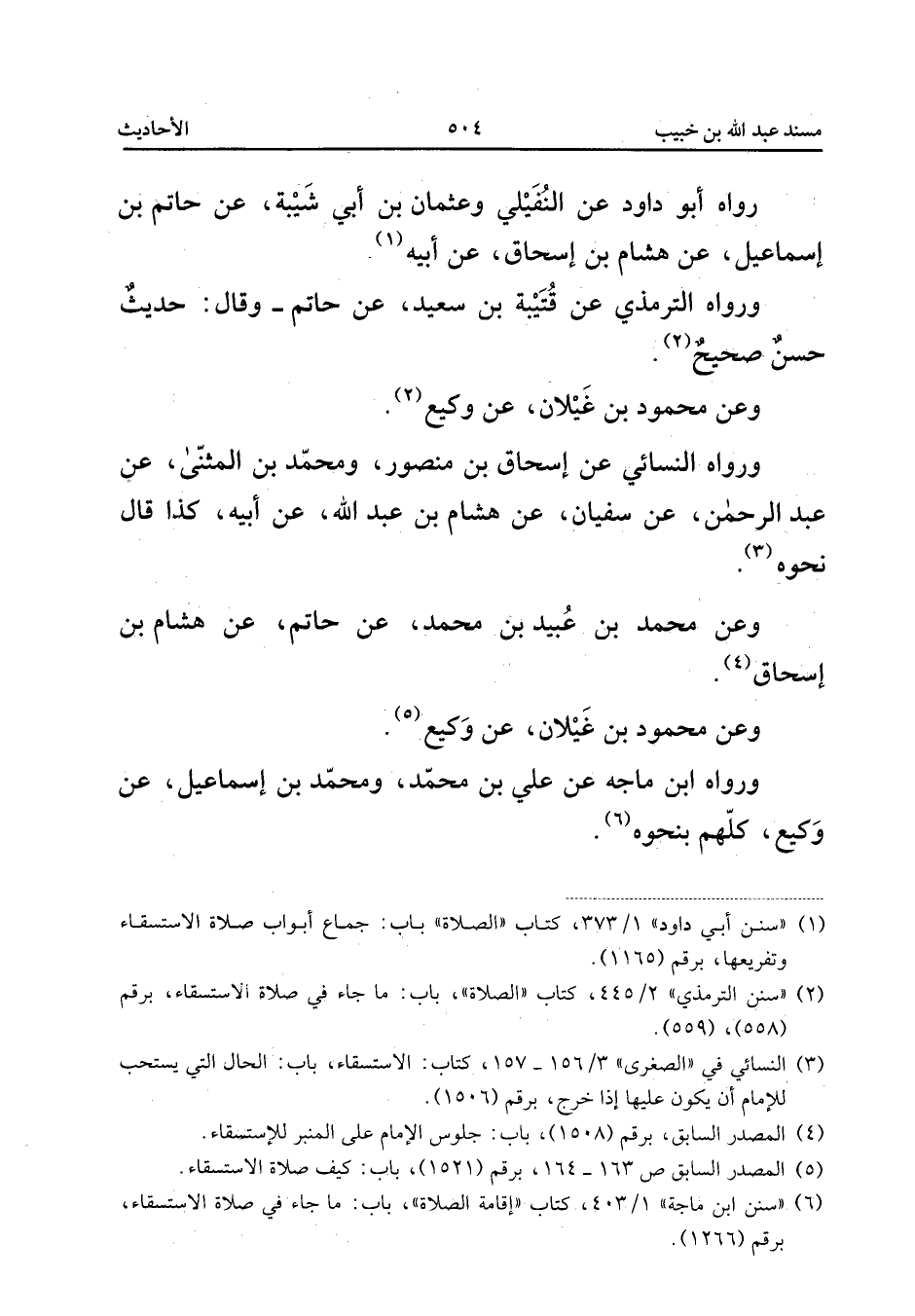 رَوَاهُ أَبُو دَاوُدَ عَنِ النُّفَيْلِيِّ وَعُثْمَانَ بْنِ أَبِي شَيْبَةَ عَنْ حَاتِمِ بْنِ إِسْمَاعِيلَ عَنْ هِشَامِ بْنِ إِسْحَاقَ عَنْ أَبِيهِ وَرَوَاهُ التِّرْمِذِيُّ عَنْ قُتَيْبَةَ بْنِ سَعِيدٍ عَنْ حَاتِمٍ وَقَالَ حَدِيثٌ حَسَنٌ صَحِيحٌ وَعَنْ مَحْمُودِ بْنِ غَيْلانَ عَنْ وَكِيعٍ وَرَوَاهُ النَّسَائِيُّ عَنْ إِسْحَاقَ بْنِ مَنْصُورٍ وَمُحَمَّدِ بْنِ الْمُثَنَّى عَنْ عَبْدِ الرَّحْمَنِ عَنْ سُفْيَانَ عَنْ هِشَامِ بْنِ عَبْدِ اللَّهِ عَنْ أَبِيهِ كَذَا قَالَ نَحْوَهُ وَعَنْ مُحَمَّدِ بْنِ عُبَيْدِ بْنِ مُحَمَّدٍ عَنْ حَاتِمٍ عَنْ هِشَامِ بْنِ إِسْحَاقَ وَعَنْ مَحْمُودِ بْنِ غَيْلانَ عَنْ وَكِيعٍ وَرَوَاهُ ابْنُ مَاجَهْ عَنْ عَلِيِّ بْنِ مُحَمَّدٍ وَمُحَمَّدِ بْنِ إِسْمَاعِيلَ عَنْ وَكِيعٍ كلهم بِنَحْوِهِ