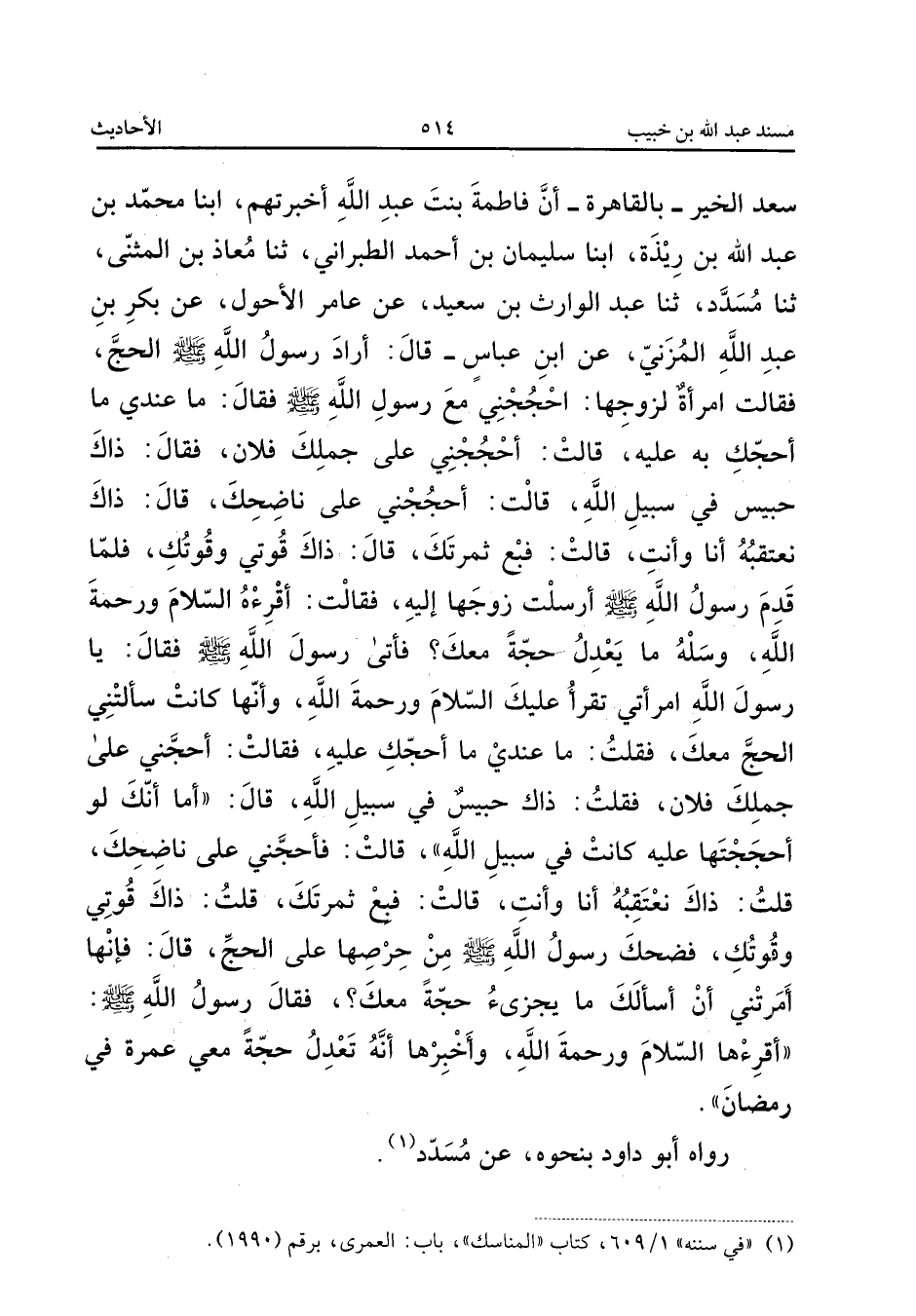 الْحَجَّ فَقَالَتِ امْرَأَةٌ لِزَوْجِهَا أَحْجِجْنِي مَعَ رَسُولِ اللَّهِ صَلَّى اللَّهُ عَلَيْهِ وَسَلَّمَ فَقَالَ مَا عِنْدِي مَا أُحِجُّكِ بِهِ عَلَيْهِ قَالَتْ أَحْجِجْنِي عَلَى جَمَلِكَ فُلانٍ فَقَالَ ذَاكَ حَبِيسٌ فِي سَبِيلِ اللَّهِ قَالَتْ أَحْجِجْنِي عَلَى نَاضِحِكَ قَالَ ذَاكَ نَعْتَقِبُهُ أَنَا وَأَنْتِ قَالَتْ فَبِعْ ثَمَرَتَكَ قَالَ ذَاك قوتي وقوتك فَلَمَّا فدم رَسُولُ اللَّهِ صَلَّى اللَّهُ عَلَيْهِ وَسَلَّمَ أَرْسَلَتْ زَوجهَا اليه فَقَالَت أقرءه السَّلامَ وَرَحْمَةَ اللَّهِ وَسَلْهُ مَا يَعْدِلُ حَجَّةً مَعَكَ فَأَتَى رَسُولَ اللَّهِ صَلَّى اللَّهُ عَلَيْهِ وَسَلَّمَ فَقَالَ يَا رَسُولَ اللَّهِ امْرَأَتِي تَقْرَأُ عَلَيْكَ السَّلامَ وَرَحْمَةَ اللَّهِ وَأَنَّهَا كَانَتْ سَأَلَتْنِي الْحَجَّ مَعَكَ فَقُلْتُ مَا عِنْدِي مَا أُحِجُّكِ عَلَيْهِ فَقَالَتْ أَحِجَّنِي عَلَى جَمَلِكَ فُلانٍ فَقُلْتُ ذَاكَ حَبِيسٌ فِي سَبِيلِ اللَّهِ قَالَ أَمَا أَنَّكَ لَوْ أَحْجَجْتَهَا عَلَيْهِ كَانَتْ فِي سَبِيلِ اللَّهِ قَالَتْ فَأَحِجَّنِي عَلَى نَاضِحِكَ قُلْتُ ذَاكَ نَعْتَقِبُهُ أَنَا وَأَنْتِ قَالَتْ فَبِعْ ثَمَرَتَكَ قُلْتُ ذَاكَ قُوتِي وَقُوتُكِ فَضَحِكَ رَسُولُ اللَّهِ صَلَّى اللَّهُ عَلَيْهِ وَسَلَّمَ مِنْ حِرْصِهَا عَلَى الْحَجِّ قَالَ فانها أَمرتنِي أَن أَسأَلك مَا يجزىء حَجَّةً مَعَكَ فَقَالَ رَسُولُ اللَّهِ صَلَّى اللَّهُ عَلَيْهِ وَسلم أقرءها السَّلامَ وَرَحْمَةَ اللَّهِ وَأَخْبِرْهَا أَنَّهُ تَعْدِلُ حِجَّةً مَعِي عُمْرَةٌ فِي رَمَضَانَ