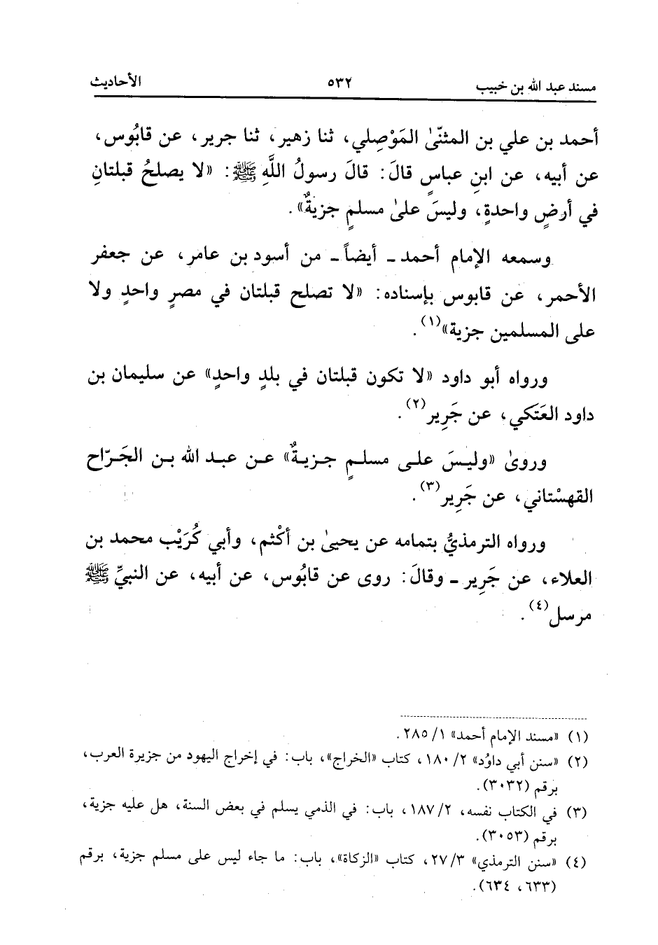 وَسَمِعَهُ الإِمَامُ أَحْمَدُ أَيْضًا مِنْ أَسْوَدَ بْنِ عَامِرٍ عَنْ جَعْفَرٍ الأَحْمَرِ عَنْ قَابُوسٍ بِإِسْنَادِهِ لَا تَصْلُحُ قِبْلَتَانِ فِي مِصْرٍ وَاحِدٍ وَلا عَلَى الْمُسْلِمِينَ جِزْيَةٌ وَرَوَاهُ أَبُو دَاوُدَ لَا تَكُونُ قِبْلَتَانِ فِي بَلَدٍ وَاحِدٍ عَنْ سُلَيْمَانَ بْنِ دَاوُدَ الْعَتَكِيِّ عَنْ جَرِيرٍ وَرَوَى وَلَيْسَ عَلَى مُسْلِمٍ جِزْيَةٌ عَنْ عَبْدِ اللَّهِ بْنِ الْجَرَّاحِ الْقُهُسْتَانِيِّ عَنْ جَرِيرٍ وَرَوَاهُ التِّرْمِذِيُّ بِتَمَامِهِ عَنْ يَحْيَى بْنِ أَكْثَمَ وَأَبِي كُرَيْبٍ مُحَمَّدِ بْنِ الْعَلاءِ عَنْ جَرِيرٍ وَقَالَ رَوَى عَنْ قَابُوسٍ عَنْ أَبِيهِ عَنِ النَّبِي صلى الله عَلَيْهِ وَسلم مُرْسل