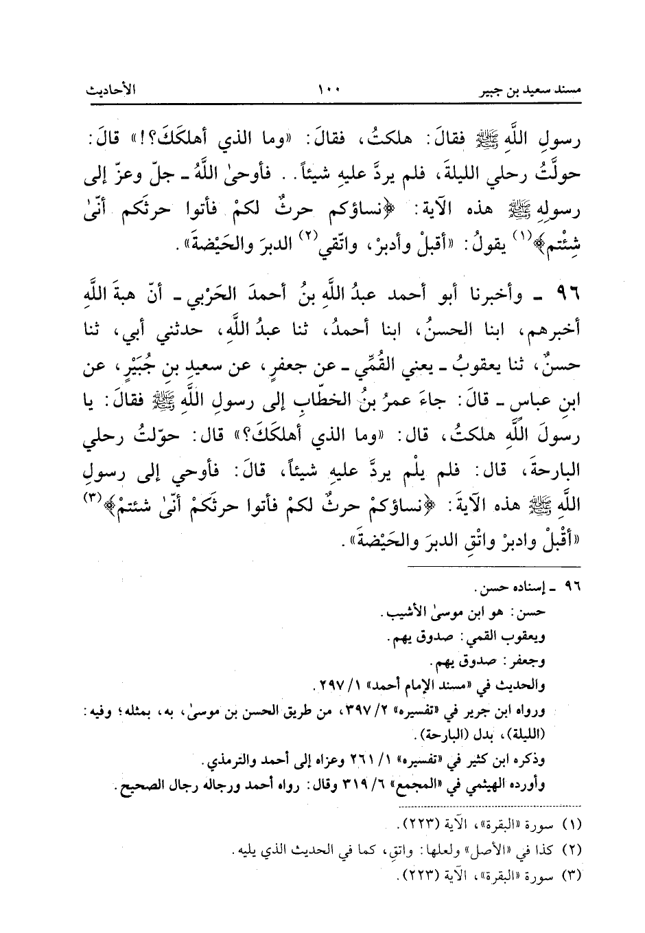 96 - وَأَخْبَرَنَا أَبُو أَحْمَدَ عَبْدُ اللَّهِ بْنُ أَحْمَدَ الْحَرْبِيُّ أَنَّ هِبَةَ اللَّهِ أَخْبَرَهُمْ أبنا الْحَسَنُ أبنا أَحْمَدُ ثَنَا عَبْدُ اللَّهِ حَدَّثَنِي أَبِي ثَنَا حَسَنٌ ثَنَا يَعْقُوبُ يَعْنِي الْقُمَّيِّ عَنْ جَعْفَرٍ عَنْ سَعِيدِ بْنِ جُبَيْرٍ عَنِ ابْنِ عَبَّاسٍ قَالَ جَاءَ عُمَرُ بْنُ الْخَطَّابِ إِلَى رَسُولِ اللَّهِ صَلَّى اللَّهُ عَلَيْهِ وَسَلَّمَ فَقَالَ يَا رَسُولَ اللَّهِ هَلَكْتُ قَالَ وَمَا الَّذِي أَهْلَكَكَ قَالَ حولت رحلي البارحة قَالَ فَلم يلم يَرُدَّ عَلَيْهِ شَيْئًا قَالَ فَأُوحِيَ إِلَى رَسُولِ اللَّهِ صَلَّى اللَّهُ عَلَيْهِ وَسَلَّمَ هَذِهِ الآيَةَ {نِسَاؤُكُمْ حَرْثٌ لَكُمْ فَأْتُوا حَرْثَكُمْ أَنَّى شِئْتُمْ} أَقْبِلْ وَأَدْبِرْ وَاتَّقِ الدُّبُرَ وَالْحَيْضَةَ