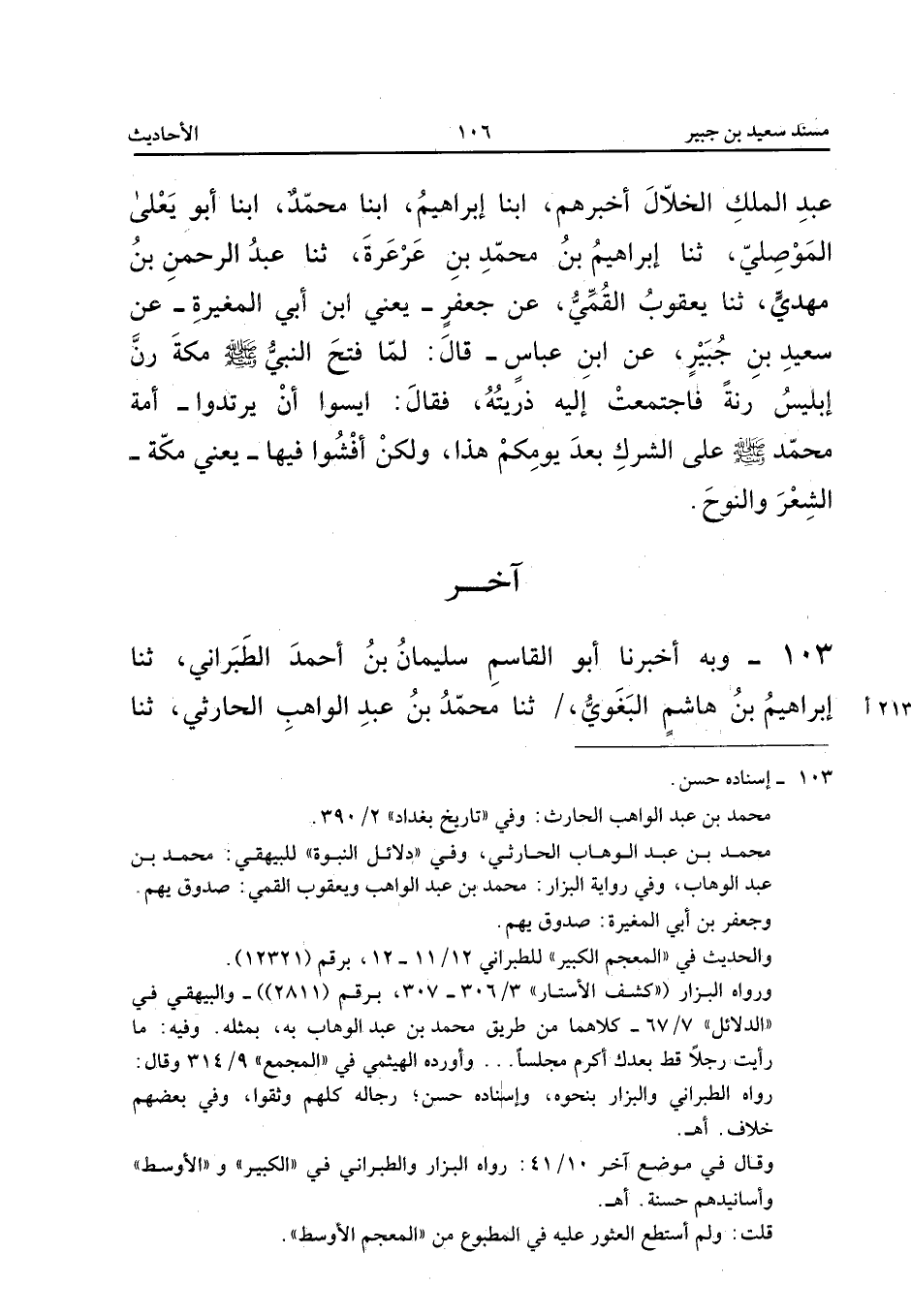103 - وَبِهِ أَخْبَرَنَا أَبُو الْقَاسِمِ سُلَيْمَانُ بْنُ أَحْمَدَ الطَّبَرَانِيُّ ثَنا إِبْرَاهِيمُ بْنُ هَاشِمٍ الْبَغَوِيُّ ثَنَا مُحَمَّدُ بْنُ عبد الْوَاهِب الْحَارِثِيُّ ثَنَا يَعْقُوبُ الْقُمِّيُّ عَنْ جَعْفَرِ بْنِ أَبِي الْمُغِيرَةِ عَنْ سَعِيدِ بْنِ جُبَيْرٍ عَنِ ابْن عَبَّاس قَالَ عَاد رَسُول الله ص