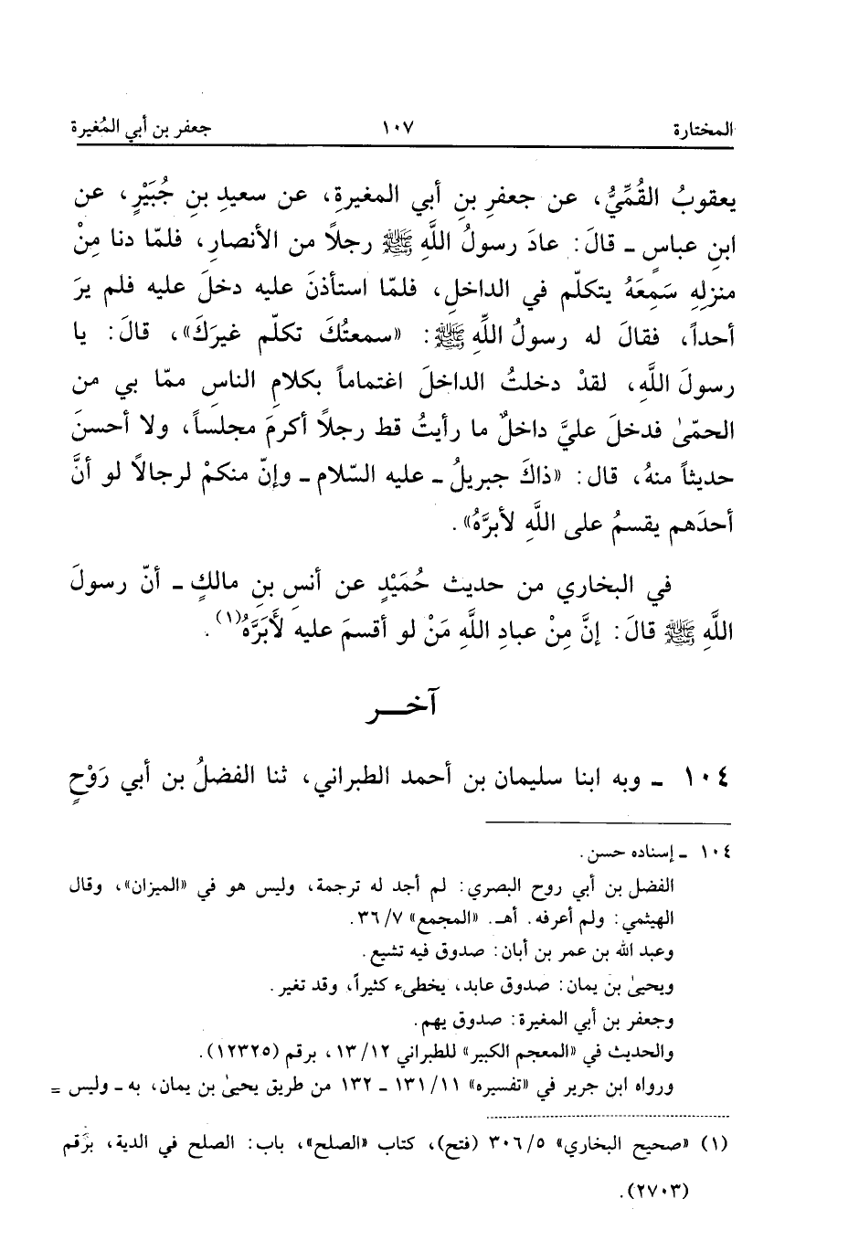 104 - وَبِهِ أَبنا سُلَيْمَانُ بْنُ أَحْمَدَ الطَّبَرَانِيُّ ثَنَا الْفَضْلُ بْنُ أَبِي رَوْحٍ الْبَصْرِيُّ ثَنَا عَبْدُ اللَّهِ بْنُ عُمَرَ بْنِ أَبَانٍ ثَنَا يَحْيَى بْنُ يَمَانٍ عَنْ أَشْعَثَ بْنِ إِسْحَاقَ عَنْ جَعْفَرِ بْنِ أَبِي الْمُغِيرَةِ عَنْ سَعِيدِ بْنِ جُبَيْرٍ عَنِ ابْنِ عَبَّاسٍ عَن النَّبِي ص