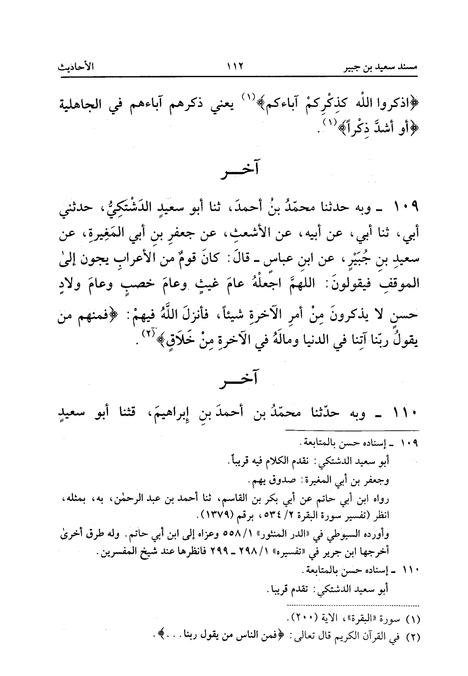 109 - وَبِهِ حَدَّثَنَا مُحَمَّدُ بْنُ أَحْمَدَ ثَنَا أَبُو سَعِيدٍ الدَّشْتَكِيُّ حَدَّثَنِي أَبِي ثَنَا أَبِي عَنْ أَبِيهِ عَنِ الأَشْعَثِ عَنْ جَعْفَرِ بْنِ أَبِي الْمُغِيرَةِ عَنْ سَعِيدِ بْنِ جُبَيْرٍ عَنِ ابْنِ عَبَّاسٍ قَالَ كَانَ قَوْمٌ مِنَ الأَعْرَابِ يجون إِلَى الْمَوْقِفِ فَيَقُولُونَ اللَّهُمَّ اجْعَلْهُ عَامَ غَيْثٍ وَعَامَ خِصْبٍ وَعَامَ وِلادٍ حَسَنٍ لَا يَذْكُرُونَ مِنْ أَمْرِ الآخِرَةِ شَيْئًا فَأَنْزَلَ اللَّهُ فِيهِمْ {فَمِنَ النَّاسِ مَنْ يَقُولُ رَبَّنَا آتِنَا فِي الدُّنْيَا وَمَا لَهُ فِي الآخِرَةِ مِنْ خَلاقٍ}