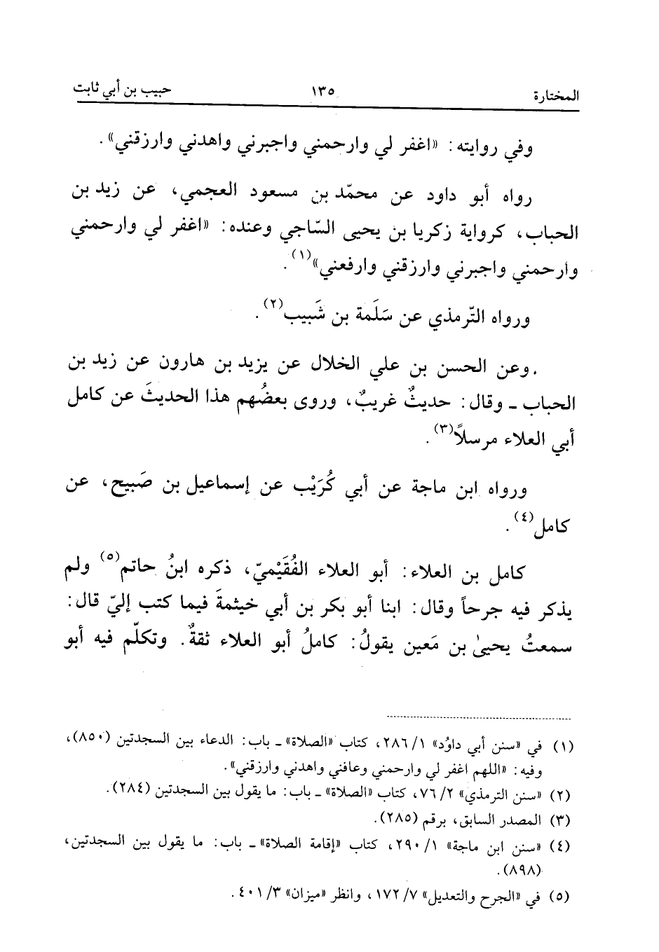 وَفِي رِوَايَتِهِ اغْفِرْ لِي وَارْحَمْنِي وَاجْبُرْنِي وَاهْدِنِي وَارْزُقْنِي رَوَاهُ أَبُو دَاوُدَ عَنْ مُحَمَّدِ بْنِ مَسْعُودٍ الْعَجَمِيِّ عَنْ زَيْدِ بْنِ الْحُبَابِ كَرِوَايَةِ زَكَرِيَّا بْنِ يَحْيَى السَّاجِيِّ وَعِنْدَهُ اغْفِرْ لِي وَارْحَمْنِي وَارْحَمْنِي وَاجْبُرْنِي وَارْزُقْنِي وَارْفَعْنِي وَرَوَاهُ التِّرْمِذِيُّ عَنْ سَلَمَةَ بْنِ شَبِيبٍ وَعَنِ الْحَسَنِ بْنِ عَلِيٍّ الْخَلالِ عَنْ يَزِيدَ بْنِ هَارُونَ عَنْ زَيْدِ بْنِ الْحُبَابِ وَقَالَ حَدِيثٌ غَرِيبٌ وَرَوَى بَعْضُهُمْ هَذَا الْحَدِيثَ عَنْ كَامِلٍ أَبِي الْعَلاءِ مُرْسَلا وَرَوَاهُ ابْنُ مَاجَهْ عَنْ أَبِي كُرَيْبٍ عَنْ إِسْمَاعِيلَ بْنِ صُبَيْحٍ عَنْ كَامِلٍ كَامِلُ بْنُ الْعَلاءِ أَبُو الْعَلاءِ الْفُقَيْمِيُّ ذَكَرَهُ ابْنُ حَاتِمٍ وَلَمْ يَذْكُرْ فِيهِ جَرْحًا وَقَالَ أبنا أَبُو بَكْرِ بْنُ أَبِي خَيْثَمَةَ فِيمَا كَتَبَ إِلَيَّ قَالَ سَمِعْتُ يَحْيَى بْنَ مَعِينٍ يَقُولُ كَامِلٌ أَبُو الْعَلاءِ ثِقَةٌ وَتَكَلَّمَ فِيهِ أَبُو