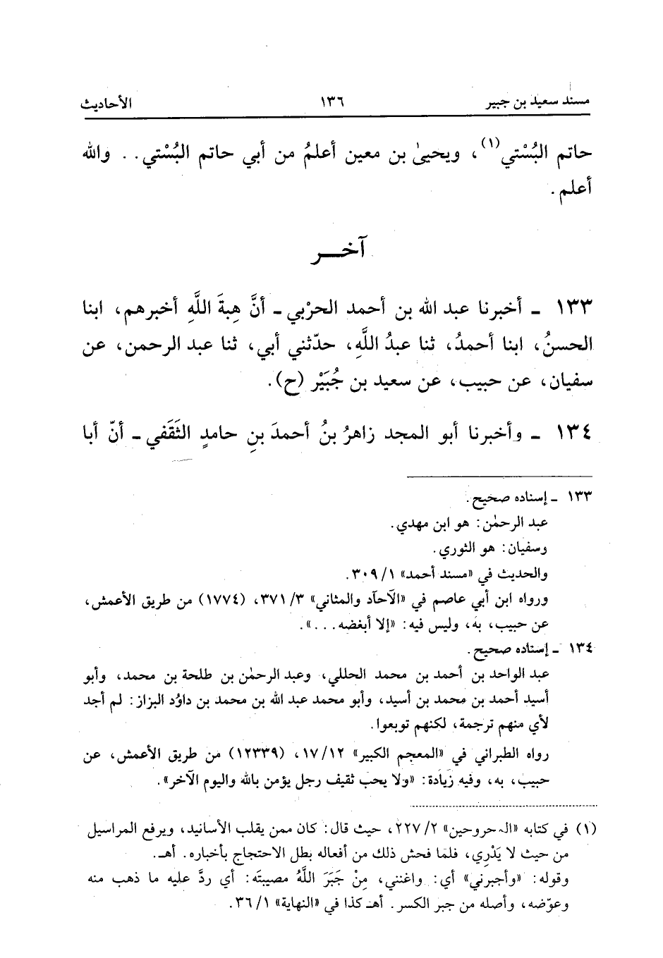 133 - أَخْبَرَنَا عَبْدُ اللَّهِ بْنُ أَحْمَدَ الْحَرْبِيُّ أَنَّ هِبَةَ اللَّهِ أَخْبَرَهُمْ أبنا الْحَسَنُ أبنا أَحْمَدُ ثَنَا عَبْدُ اللَّهِ حَدَّثَنِي أَبِي ثَنَا عَبْدُ الرَّحْمَنِ عَنْ سُفْيَانَ عَنْ حَبِيبٍ عَنْ سَعِيدِ بْنِ جُبَيْرٍ (ح)