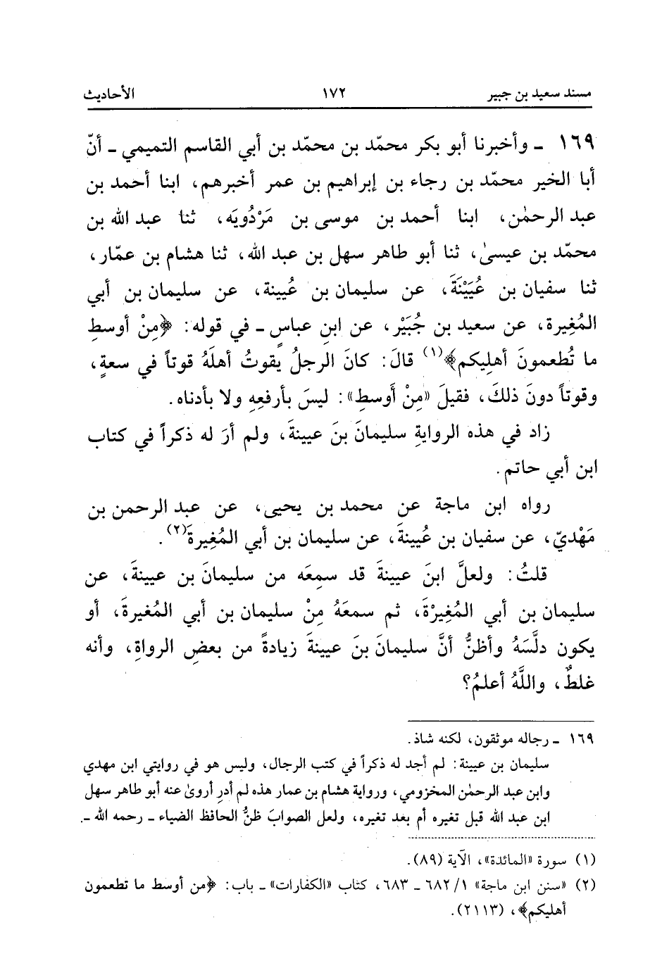 169 - وَأَخْبَرَنَا أَبُو بَكْرٍ مُحَمَّدُ بْنُ مُحَمَّدِ بْنِ أَبِي الْقَاسِمِ التَّمِيمِيُّ أَنَّ أَبَا الْخَيْرِ مُحَمَّدَ بْنَ رَجَاءِ بْنِ إِبْرَاهِيمَ بْنِ عُمَرَ أَخْبَرَهُمْ أبنا أَحْمَدُ بْنُ عَبْدِ الرَّحْمَنِ أبنا أَحْمَدُ بْنُ مُوسَى بْنِ مَرْدَوَيْهِ ثَنَا عَبْدُ اللَّهِ بْنُ مُحَمَّدِ بْنِ عِيسَى ثَنَا أَبُو طَاهِرٍ سَهْلُ بْنُ عَبْدِ اللَّهِ ثَنَا هِشَامُ بْنُ عَمَّارٍ ثَنَا سُفْيَانُ بْنُ عُيَيْنَةَ عَنْ سُلَيْمَانَ بْنِ عُيَيْنَةَ عَنْ سُلَيْمَانَ بْنِ أَبِي الْمُغِيرَةِ عَنْ سَعِيدِ بْنِ جُبَيْرٍ عَنِ ابْنِ عَبَّاسٍ فِي قَوْلِهِ {مِنْ أَوْسَطِ مَا تُطْعِمُونَ أَهْلِيكُمْ} قَالَ كَانَ الرَّجُلُ يَقُوتُ أَهْلَهُ قُوتًا فِي سَعَةٍ وَقُوتًا دُونَ ذَلِكَ فَقِيلَ مِنْ أَوْسَطِ لَيْسَ بِأَرْفَعِهِ وَلا بِأَدْنَاهُ