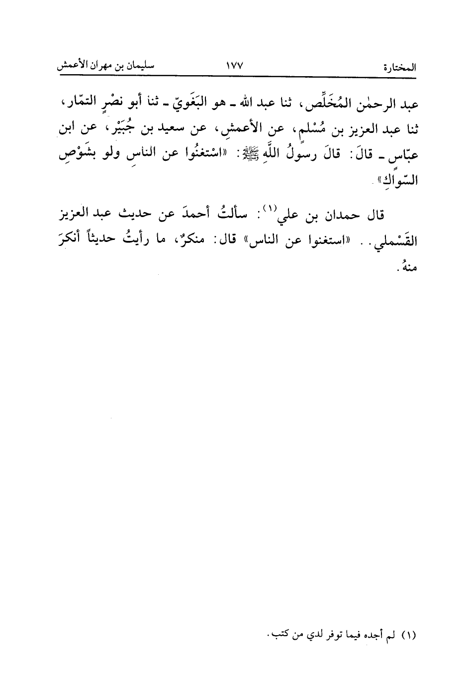 اسْتَغْنُوا عَنِ النَّاسِ وَلَوْ بِشَوْصِ السِّوَاكِ قَالَ حَمْدَانُ بْنُ عَلِيٍّ سَأَلْتُ أَحْمَدَ عَنْ حَدِيثِ عَبْدِ الْعَزِيزِ الْقَسْمَلِيِّ اسْتَغْنُوا عَنِ النَّاسِ قَالَ مُنْكَرٌ مَا رَأَيْتُ حَدِيثًا أَنْكَرَ مِنْهُ