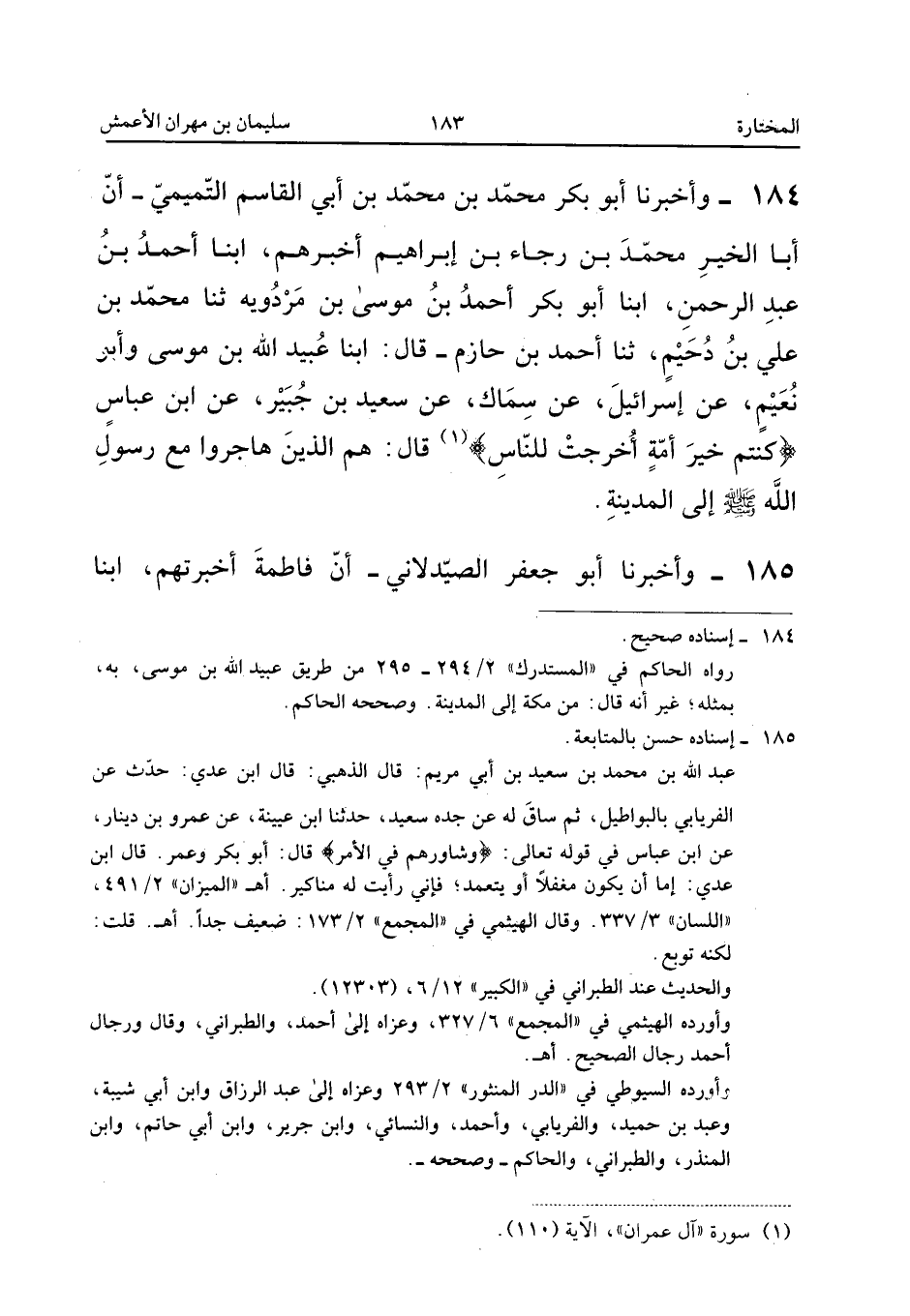 184 - وَأَخْبَرَنَا أَبُو بَكْرٍ مُحَمَّدُ بْنُ مُحَمَّدِ بْنِ أَبِي الْقَاسِمِ التَّمِيمِيُّ أَنَّ أَبَا الْخَيْرِ مُحَمَّدَ بْنَ رَجَاءِ بْنِ إِبْرَاهِيمَ أَخْبَرَهُمْ أبنا أَحْمَدُ بْنُ عَبْدِ الرَّحْمَنِ أبنا أَبُو بَكْرٍ أَحْمَدُ بْنُ مُوسَى بْنِ مَرْدَوَيْهِ ثَنَا مُحَمَّدُ بْنُ عَبْدِ الرَّحْمَنِ أبنا أَبُو بَكْرٍ أَحْمَدُ بْنُ مُوسَى بْنِ مَرْدَوَيْهِ ثَنَا مُحَمَّدُ بْنُ عَلِيِّ بْنِ دُحَيْمٍ ثَنَا أَحْمَدُ بْنُ حَازِمٍ قَالَ أبنا عُبَيْدُ اللَّهِ بْنُ مُوسَى وَأَبُو نُعَيْمٍ عَنْ إِسْرَائِيلَ عَنْ سِمَاكٍ عَنْ سَعِيدِ بْنِ جُبَيْرٍ عَنِ ابْنِ عَبَّاسٍ {كُنْتُمْ خَيْرَ أُمَّةٍ أخرجت للنَّاس} قَالَ هُمُ الَّذِينَ هَاجَرُوا مَعَ رَسُولِ اللَّهِ صَلَّى اللَّهُ عَلَيْهِ وَسَلَّمَ إِلَى الْمَدِينَةِ