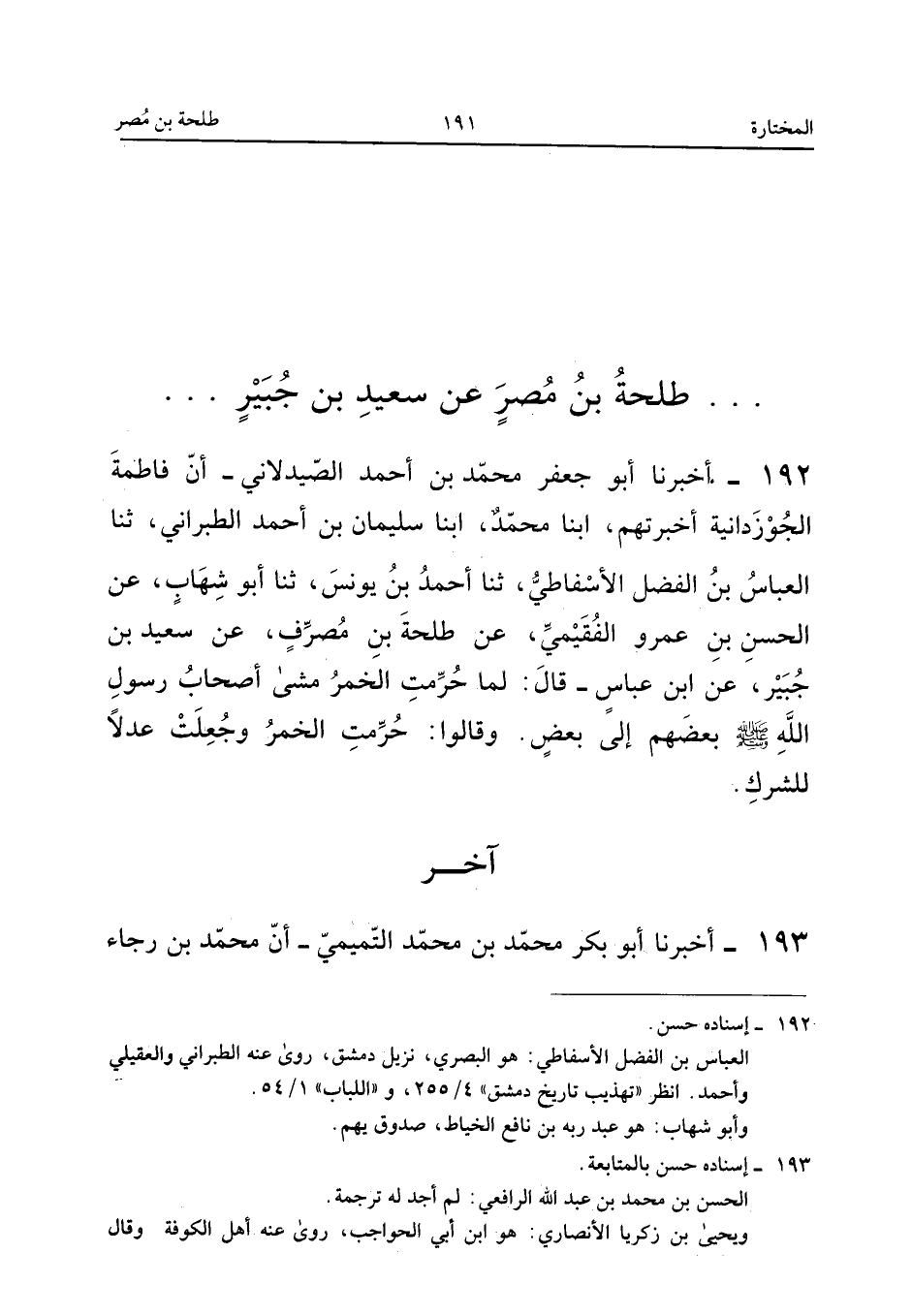 192 - أَخْبَرَنَا أَبُو جَعْفَرٍ مُحَمَّد بن أَحْمد الصيدلاني أَن فَاطِمَة الجوزداينة أَخْبَرَتْهُمْ أبنا مُحَمَّدٌ أبنا سُلَيْمَانُ بْنُ أَحْمَدَ الطَّبَرَانِيُّ ثَنَا الْعَبَّاسُ بْنُ الْفَضْلِ الأَسْفَاطِيُّ ثَنَا أَحْمَدُ بْنُ يُونُسَ ثَنَا أَبُو شِهَابٍ عَنْ الْحَسَنِ بْنِ عَمْرٍو الْفُقَيْمِيِّ عَنْ طَلْحَةَ بْنِ مُصَرِّفٍ عَنْ سَعِيدِ بْنِ جُبَيْرٍ عَنِ ابْنِ عَبَّاسٍ قَالَ لَمَّا حُرِّمَتِ الْخَمْرُ مَشَى أَصْحَابُ رَسُولِ اللَّهِ صَلَّى اللَّهُ عَلَيْهِ وَسَلَّمَ بَعْضُهُمْ إِلَى بَعْضٍ وَقَالُوا حُرِّمَتِ الْخَمْرُ وَجُعِلَتْ عَدْلا لِلشِّرْكِ