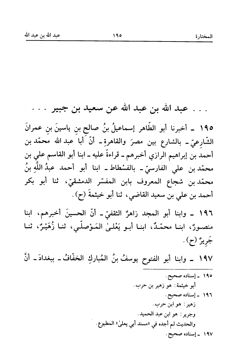 196 - وَأَبْنا أَبُو الْمَجْدِ زَاهِرٌ الثَّقَفِيُّ أَنَّ الْحُسَيْنَ أَخْبَرَهُمْ ابْنا مَنْصُورٌ أبنا مُحَمَّدٌ أبنا أَبُو يَعْلَى الْمَوْصِلِيُّ ثَنَا زُهَيْرٌ ثَنَا جَرِيرٌ (ح)