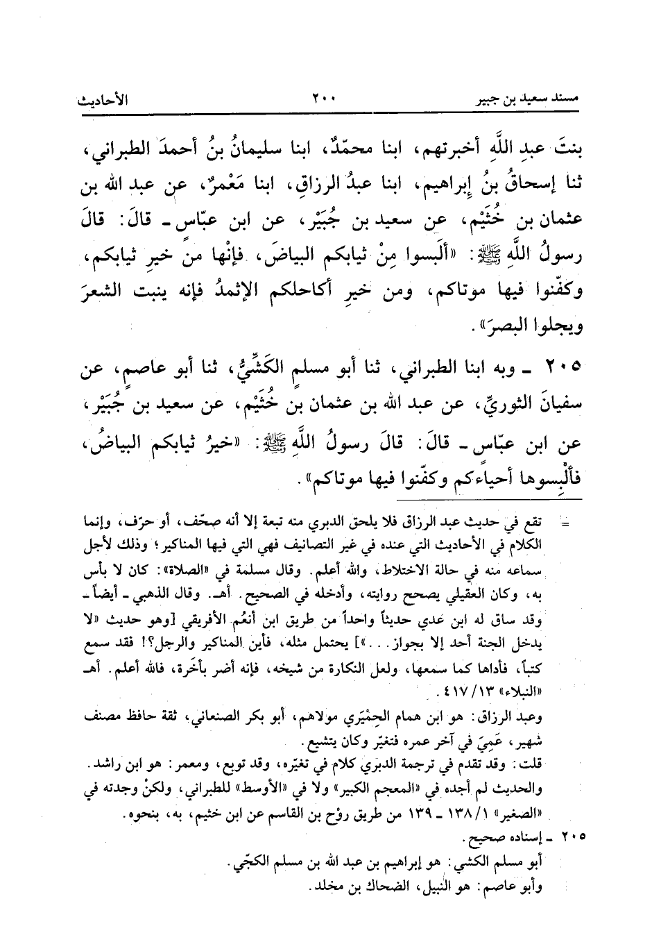 205 - وَبِهِ أَبنا الطَّبَرَانِيُّ ثَنَا أَبُو مُسْلِمٍ الْكَشِّيُّ ثَنَا أَبُو عَاصِمٍ عَنْ سُفْيَانَ الثَّوْرِيِّ عَنْ عَبْدِ اللَّهِ بْنِ عُثْمَانَ بْنِ خُثَيْمٍ عَنْ سَعِيدِ بْنِ جُبَيْرٍ عَنِ ابْنِ عَبَّاسٍ قَالَ قَالَ رَسُول الله خَيْرُ ثِيَابِكُمُ الْبَيَاضُ فَأَلْبِسُوهَا أَحْيَاءَكُمْ وَكَفِّنُوا فِيهَا مَوْتَاكُم