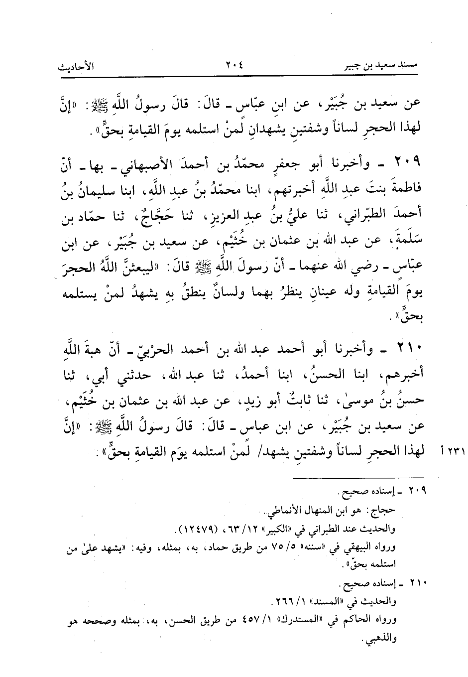 209 - وَأَخْبَرَنَا أَبُو جَعْفَرٍ مُحَمَّدُ بْنُ أَحْمَدَ الأَصْبَهَانِيُّ بِهَا أَنَّ فَاطِمَةَ بِنْتَ عَبْدِ اللَّهِ أَخْبَرَتْهُمْ أبنا مُحَمَّدُ بْنُ عَبْدِ اللَّهِ أبنا سُلَيْمَانُ بْنُ أَحْمَدَ الطَّبَرَانِيُّ ثَنَا عَلِيُّ بْنُ عَبْدِ الْعَزِيزِ ثَنَا حَجَّاجُ ثَنَا حَمَّادُ بْنُ سَلَمَةَ عَنْ عَبْدِ اللَّهِ بْنُ عُثْمَانَ بْنِ خُثَيْمٍ عَنْ سَعِيدِ بْنِ جُبَيْرٍ عَنِ ابْنِ عَبَّاسٍ رَضِيَ اللَّهُ عَنْهُمَا إِنَّ رَسُولَ اللَّهِ صَلَّى اللَّهُ عَلَيْهِ وَسَلَّمَ قَالَ لَيَبْعَثَنَّ اللَّهُ الْحَجَرَ يَوْمَ الْقِيَامَةِ وَلَهُ عَيْنَانِ يَنْظُرُ بِهِمَا وَلِسَانٌ يَنْطِقُ بِهِ يَشْهَدُ لِمَنْ يَسْتَلِمُهُ بِحَقٍّ