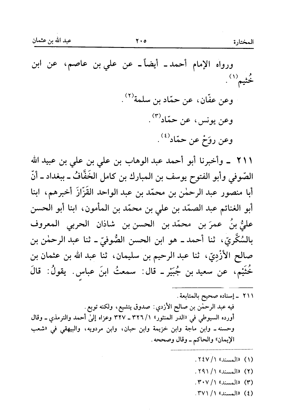 211 - وَأَخْبَرَنَا أَبُو أَحْمَدَ عَبْدُ الْوَهَّابِ بْنُ عَلِيِّ بْنِ عَلِيُّ بْنُ عُبَيْدِ اللَّهِ الصُّوفِيُّ وَأَبُو الْفُتُوحِ يُوسُفُ بْنُ الْمُبَارَكِ بْنِ كَامِلٍ الْخَفَّافُ بِبَغْدَادَ أَنَّ أَبَا مَنْصُورٍ عَبْدَ الرَّحْمَنِ بْنَ مُحَمَّدِ بْنِ عَبْدِ الْوَاحِدِ الْقَزَّازَ أَخْبَرَهُمْ أبنا أَبُو الْغَنَائِمِ عَبْدُ الصَّمَدِ بْنُ عَلِيِّ بْنِ مُحَمَّدِ بْنِ الْمَأْمُونِ أبنا أَبُو الْحَسَنِ عَلِيُّ بْنُ عُمَرِ بْنِ مُحَمَّدِ بْنِ الْحَسَنِ بْنِ شَاذَانَ الْحَرْبِيُّ الْمَعْرُوفُ بِالسُّكَّرِيِّ ثَنَا أَحْمَدُ هُوَ ابْنُ الْحَسَنِ الصُّوفِيُّ ثَنَا عَبْدُ الرَّحْمَنِ بْنُ صَالِحٍ الأَزْدِيُّ ثَنَا عَبْدُ الرَّحِيمِ بْنُ سُلَيْمَانَ ثَنَا عَبْدُ اللَّهِ بْنُ عُثْمَانَ بْنِ خَثْيَمٍ عَنْ سَعِيدِ بْنِ جُبَيْرٍ قَالَ سَمِعْتُ ابْنَ عَبَّاس يَقُول قَالَ رَسُول الله ص