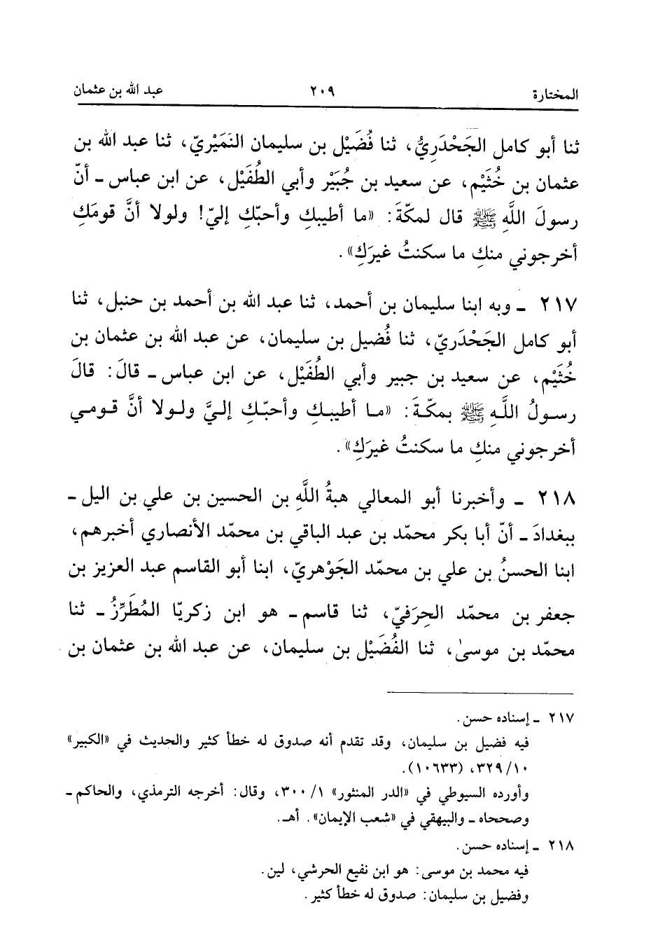 217 - وَبِهِ أبنا سُلَيْمَانُ بْنُ أَحْمَدَ ثَنَا عَبْدُ اللَّهِ بْنُ أَحْمَدَ بْنِ حَنْبَلٍ ثَنَا أَبُو كَامِلٍ الْجَحْدَرِيُّ ثَنَا فُضَيْلُ بْنُ سُلَيْمَانَ عَنْ عَبْدِ اللَّهِ بْنِ عُثْمَانَ بْنِ خَثْيَمٍ عَنْ سَعِيدِ بْنِ جُبَيْرٍ وَأَبِي الطُّفَيْلِ عَنِ ابْنِ عَبَّاسٍ قَالَ قَالَ رَسُولُ اللَّهِ صَلَّى اللَّهُ عَلَيْهِ وَسَلَّمَ بِمَكَّةَ مَا أَطْيَبَكِ وَأَحَبَّكِ إِلَيَّ وَلَوْلا أَنَّ قَوْمِي أَخْرَجُونِي مِنْكِ مَا سَكَنْتُ غَيْرَكِ