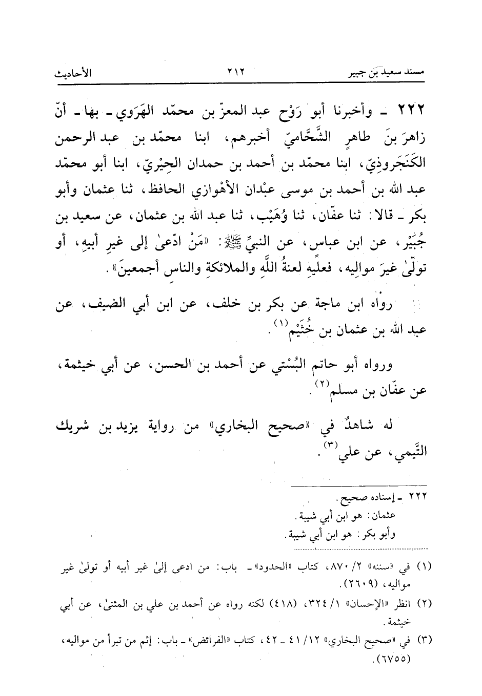222 - وَأَخْبَرَنَا أَبُو رَوْحٍ عَبْدُ الْمُعِزِّ بْنُ مُحَمَّدِ الْهَرَوِيُّ بِهَا أَنَّ زَاهِرَ بْنَ طَاهِرٍ الشَّحَّامِيَّ أَخْبَرَهُمْ أبنا مُحَمَّدُ بْنُ عَبْدِ الرَّحْمَنِ الْكَنْجَرُوذِيُّ أبنا مُحَمَّدُ بْنُ أَحْمَدَ بْنِ حَمْدَانَ الْحِيرِيُّ أبنا أَبُو مُحَمَّدٍ عَبْدُ اللَّهِ بْنُ أَحْمَدَ بْنِ مُوسَى عَبْدَانُ الأَهْوَازِيُّ الْحَافِظُ ثَنَا عُثْمَانُ وَأَبُو بَكْرٍ قَالا ثَنَا عَفَّانُ ثَنَا وُهَيْبٌ ثَنَا عَبْدِ اللَّهِ بْنِ عُثْمَانَ عَنْ سَعِيدِ بْنِ جُبَيْرٍ عَنِ ابْنِ عَبَّاسٍ عَنِ النَّبِيِّ صَلَّى اللَّهُ عَلَيْهِ وَسَلَّمَ مَنِ ادَّعَى إِلَى غَيْرِ أَبِيهِ أَوْ تَوَلَّى غَيْرَ مَوَالِيهِ فَعَلَيْهِ لَعْنَةُ الله الْمَلَائِكَة وَالنَّاسِ أَجْمَعِينَ
