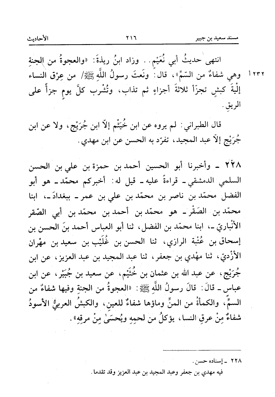 228 - وَأَخْبَرَنَا أَبُو الْحُسَيْنِ أَحْمَدُ بْنُ حمزه بن عَليّ بن الْحسن السّلمِيّ الدمشي قِرَاءَةً عَلَيْهِ قِيلَ لَهُ أَخْبَرَكُمْ مُحَمَّدٌ هُوَ أَبُو الْفَضْلِ مُحَمَّدُ بْنُ نَاصِرِ بْنِ مُحَمَّدِ بْنِ عَلِيِّ بْنِ عُمَرَ بِبَغْدَادَ أبنا مُحَمَّدُ بْنُ الصَّقْرِ هُوَ مُحَمَّدُ بْنُ أَحْمَدَ بْنِ مُحَمَّدِ بْنِ أَبِي الصَّقْرِ الأَنْبَارِيُّ أبنا مُحَمَّدُ بْنُ الْفَضْلِ ثَنَا أَبُو الْعَبَّاسِ أَحْمَدُ بْنُ الْحَسَنِ بْنِ إِسْحَاقَ بْنِ عُتْبَةَ الرَّازِيُّ ثَنَا الْحَسَنُ بْنُ غُلَيْبِ بْنِ سَعِيدِ بْنِ مِهْرَانَ الأَزْدِيُّ ثَنَا مَهْدِيُّ بْنُ جَعْفَرٍ ثَنَا عَبْدُ الْمَجِيدِ بْنُ عَبْدِ الْعَزِيزِ عَنِ ابْنِ جُرَيْجٍ عَنْ عَبْدِ اللَّهِ بْنِ عُثْمَانَ بْنِ خُثَيْمٍ عَنْ سَعِيدِ بْنِ جُبَيْرٍ عَنِ ابْنِ عَبَّاسٍ قَالَ قَالَ رَسُول الل صَلَّى اللَّهُ عَلَيْهِ وَسَلَّمَ الْعَجْوَةُ مِنَ الْجَنَّةِ وَفِيهَا شِفَاءٌ مِنَ السُّمِّ وَالْكَمَأَةُ مِنَ الْمَنِّ وَمَاؤُهَا شِفَاءٌ لِلْعَيْنِ وَالْكَبْشُ الْعَرَبِيُّ الأَسْوَدُ شِفَاءٌ مِنْ عِرْقِ النَّسَا يُؤْكَلُ مِنْ لَحْمِهِ وَيُحْسَى من مرقه