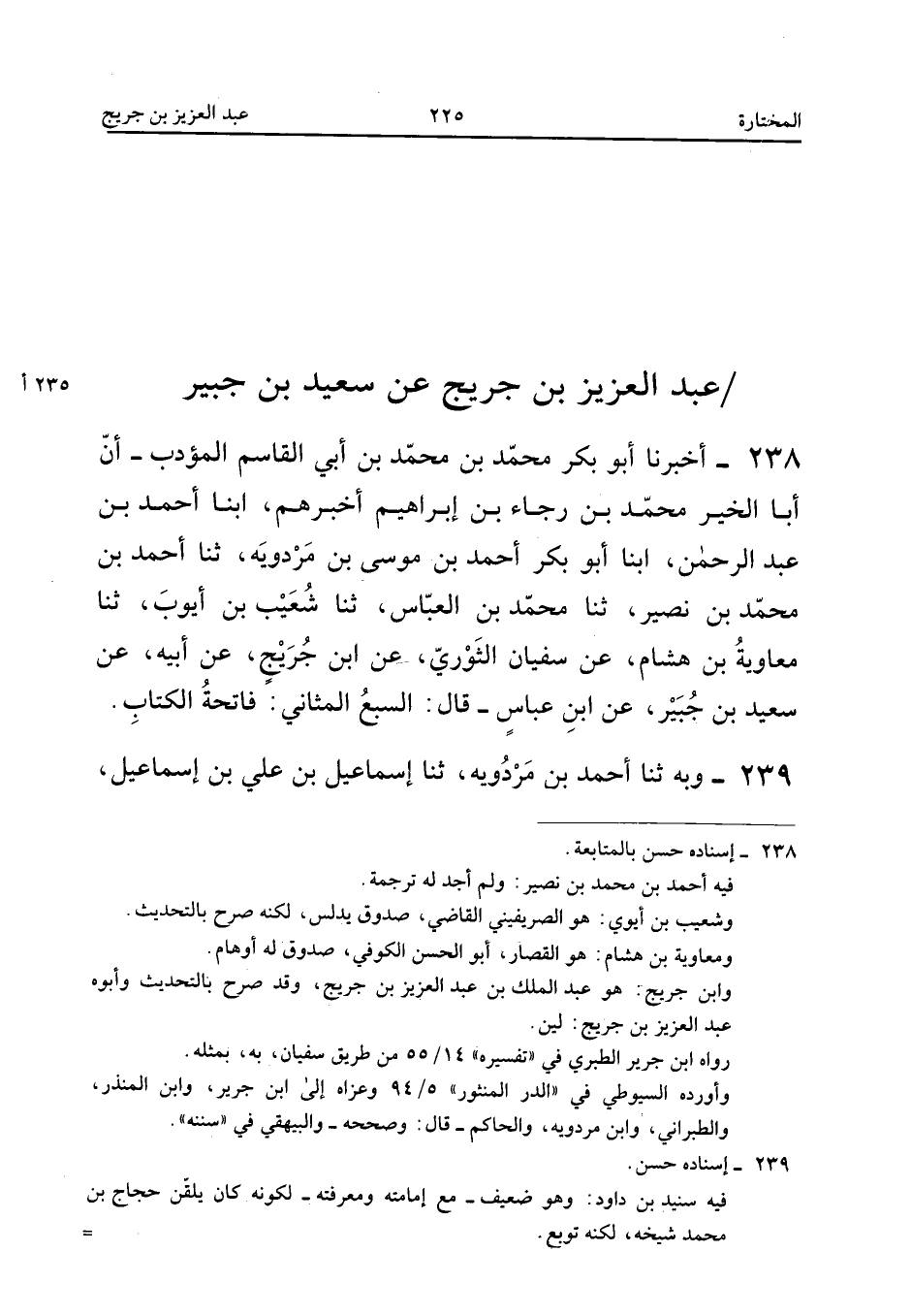 238 - أَخْبَرَنَا أَبُو بَكْرٍ مُحَمَّدُ بْنُ مُحَمَّدِ بْنِ أَبِي الْقَاسِمِ الْمُؤَدِّبُ أَنَّ أَبَا الْخَيْرِ مُحَمَّدَ بْنَ رَجَاءِ بْنِ إِبْرَاهِيمَ أَخْبَرَهُمْ أبنا أَحْمَدُ بْنُ عَبْدِ الرَّحْمَنِ أبنا أَبُو بَكْرٍ أَحْمَدُ بْنُ مُوسَى بْنِ مَرْدُوَيْهِ ثَنَا أَحْمَدُ بْنُ مُحَمَّدِ بْنِ نُصَيْرٍ ثَنَا مُحَمَّدُ بْنُ الْعَبَّاسِ ثَنَا شُعَيْبُ بْنُ أَيُّوبَ ثَنَا مُعَاوِيَةُ بْنُ هِشَامٍ عَنْ سُفْيَانَ الثَّوْرِيِّ عَنِ ابْنِ جُرَيْجٍ عَنْ أَبِيهِ عَنْ سَعِيدِ بْنِ جُبَيْرٍ عَنِ ابْنِ عَبَّاسٍ قَالَ السَّبْعُ الْمَثَانِي فَاتِحَةَ الْكِتَابِ