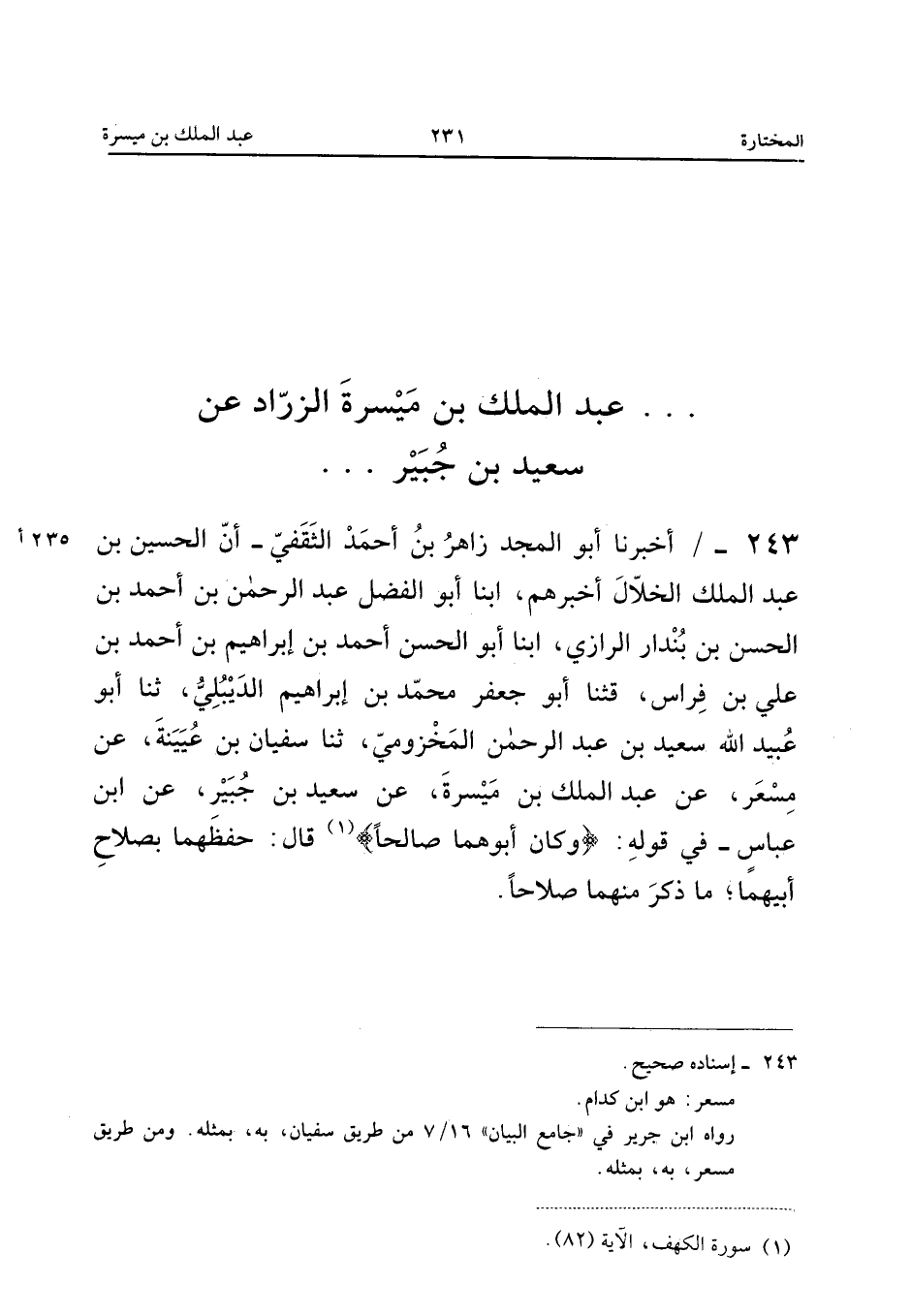 243 - أَخْبَرَنَا أَبُو الْمَجْدِ زَاهِرُ بْنُ أَحْمَدَ الثَّقَفِيُّ أَنَّ الْحُسَيْنَ بْنَ عَبْدِ الْمَلِكِ الْخَلالَ أَخْبَرَهُمْ أبنا أَبُو الْفَضْلِ عَبْدُ الرَّحْمَنِ بْنُ أَحْمَدَ بْنِ الْحَسَنِ بْنِ بُنْدَارٍ الرَّازِيُّ أبنا أَبُو الْحَسَنِ أَحْمَدُ بْنُ إِبْرَاهِيمَ بْنِ أَحْمَدَ بْنِ عَلِيِّ بْنِ فِرَاسٍ قَثَنَا أَبُو جَعْفَرٍ مُحَمَّدُ بْنُ إِبْرَاهِيمَ الدَّيْبُلِيُّ ثَنَا أَبُو عُبَيْدِ اللَّهِ سَعِيدُ بْنُ عَبْدِ الرَّحْمَنِ الْمَخْزُومِيُّ ثَنَا سُفْيَانُ بْنُ عُيَيْنَةَ عَنْ مِسْعَرٍ عَنْ عَبْدِ الْمَلِكِ بْنِ مَيْسَرَةَ عَنْ سَعِيدِ بْنِ جُبَيْرٍ عَنِ ابْنِ عَبَّاسٍ فِي قَوْلِهِ {وَكَانَ أَبوهُمَا صَالحا} قَالَ حَفِظَهُمَا بِصَلاحِ أَبِيهِمَا مَا ذُكِرَ مِنْهُمَا صلاحا