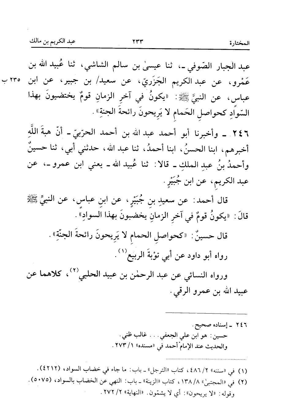 246 - وَأَخْبَرَنَا أَبُو أَحْمَدَ عَبْدُ اللَّهِ بْنُ أَحْمَدَ الْحَرْبِيُّ أَنَّ هِبَةَ اللَّهِ أَخْبَرَهُمْ أبنا الْحَسَنُ أبنا أَحْمَدُ ثَنَا عَبْدُ اللَّهِ حَدَّثَنِي أَبِي ثَنَا حُسَيْنٌ وَأَحْمَدُ بْنُ عَبْدِ الْمَلِكِ قَالا ثَنَا عُبَيْدُ اللَّهِ يَعْنِي ابْنَ عَمْرٍو عَنْ عَبْدِ الْكَرِيمِ عَنِ ابْنِ جُبَيْرٍ قَالَ أَحْمَدُ عَنْ سَعِيدِ بْنِ جُبَيْرٍ عَنِ ابْنِ عَبَّاسٍ عَنِ النَّبِيِّ صَلَّى اللَّه عَلَيْهِ وَسَلَّمَ قَالَ يَكُونُ قَوْمٌ فِي آخِرِ الزَّمَانِ يَخْضِبُونَ بِهَذَا السَّوَادِ قَالَ حُسَيْنٌ كَحَوَاصِلِ الْحَمَامِ لَا يَرِيحُونَ رَائِحَةَ الْجَنَّةِ