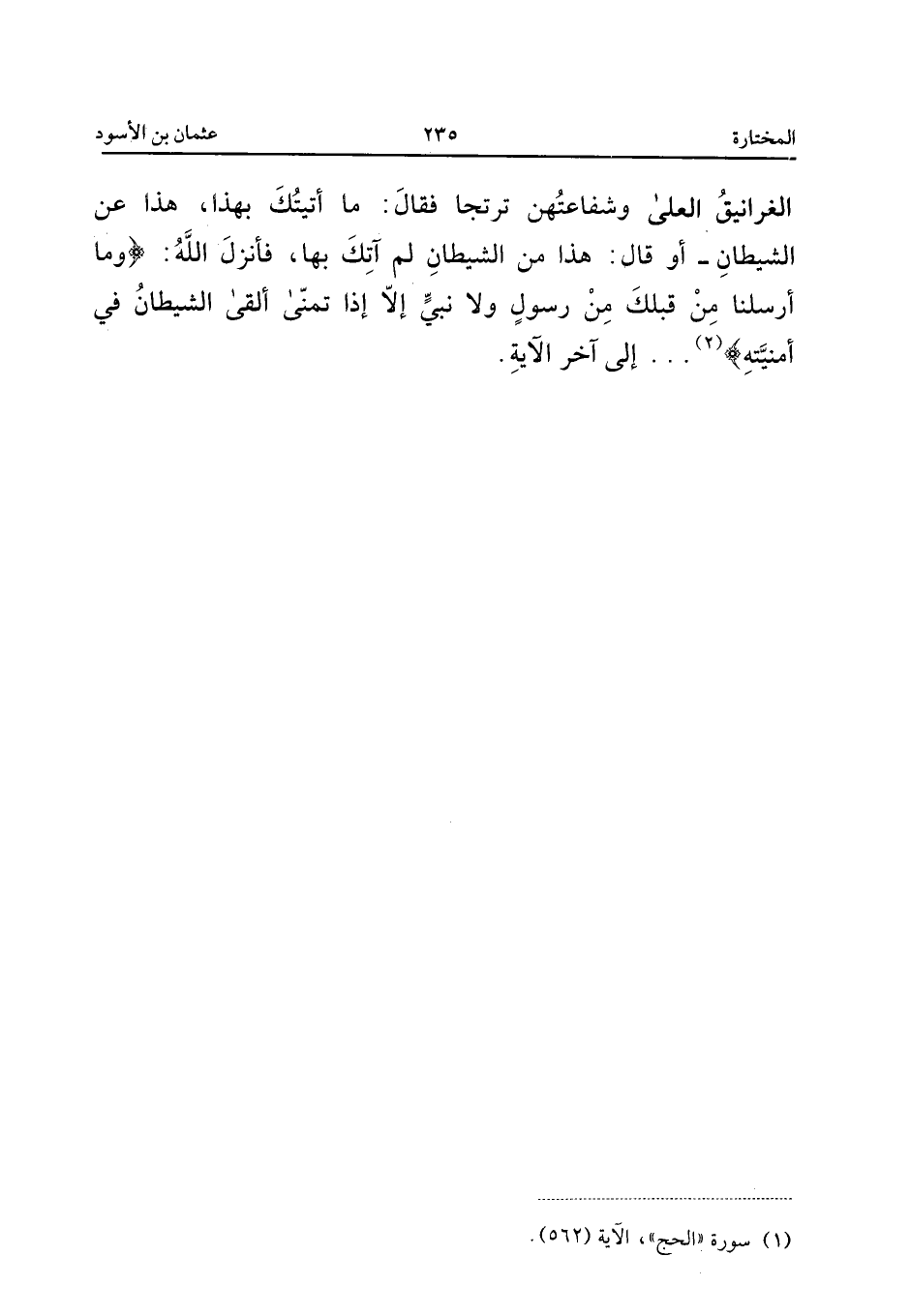 الغرانيق العلى وَشَفَاعَتهنَّ ترتجا فَقَالَ مَا أَتَيْتُكَ بِهَذَا هَذَا عَنِ الشَّيْطَانِ أَوْ قَالَ هَذَا مِنَ الشَّيْطَانِ لَمْ آتِكَ بِهَا فَأَنْزَلَ اللَّهُ {وَمَا أَرْسَلْنَا مِنْ قَبْلِكَ مِنْ رَسُولٍ وَلا نَبِيٍّ إِلا إِذَا تَمَنَّى ألْقى الشَّيْطَان فِي أمْنِيته} إِلَى آخِرِ الآيَةِ