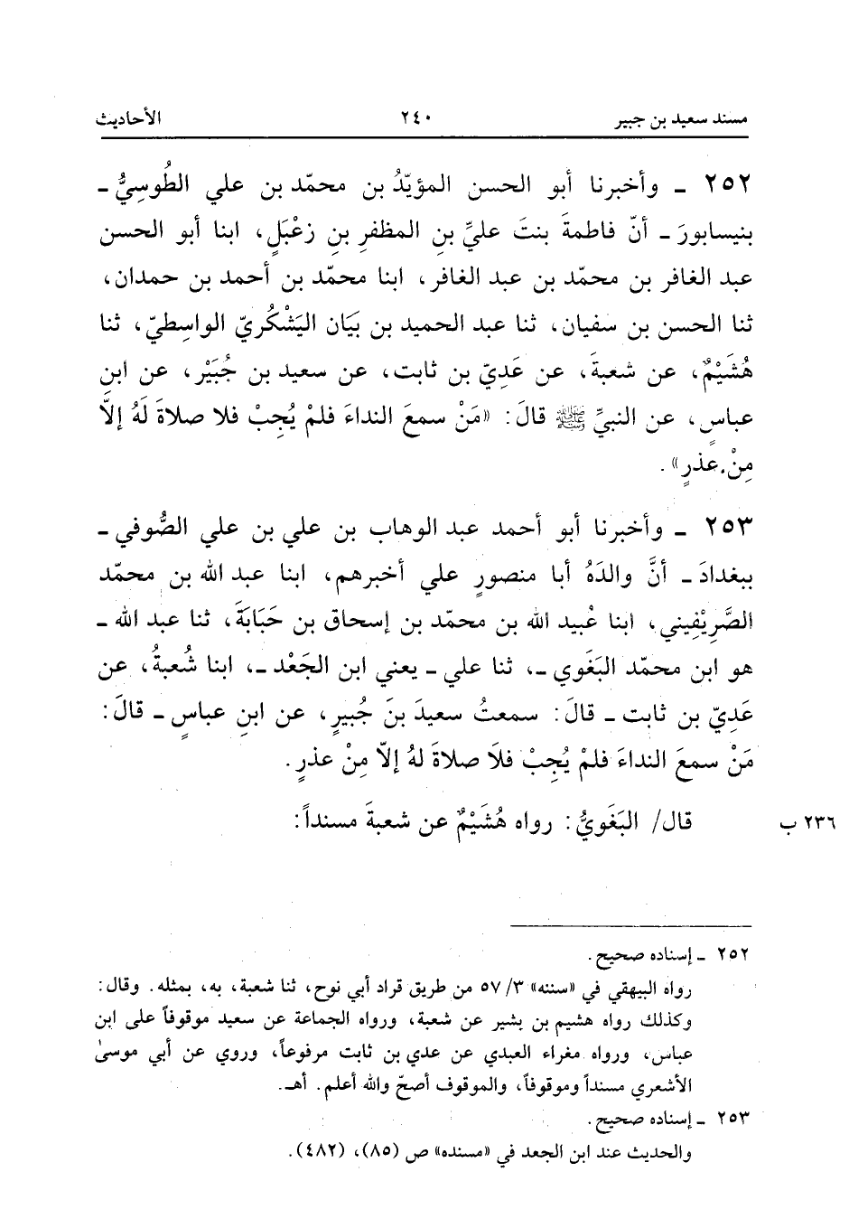 253 - وَأَخْبَرَنَا أَبُو أَحْمَدَ عَبْدُ الْوَهَّابِ بْنُ عَلِيِّ بْنِ عَلِيٍّ الصُّوفِيُّ بِبَغْدَادَ أَنَّ وَالِدَهُ أَبَا مَنْصُور عَليّ أَخْبَرَهُمْ أبنا عَبْدُ اللَّهِ بْنُ مُحَمَّدٍ الصَّرِيفِينِيُّ أبنا عُبَيْدُ اللَّهِ بْنُ مُحَمَّدِ بْنِ إِسْحَاقَ بْنِ حُبَابَةَ ثَنَا عَبْدُ اللَّهِ هُوَ ابْنُ مُحَمَّدٍ الْبَغَوِيُّ ثَنَا عَلِيٌّ يَعْنِي ابْنُ الْجَعْدِ أبنا شُعْبَةُ عَنْ عَدِيِّ بْنِ ثَابِتٍ قَالَ سَمِعْتُ سَعِيدَ بْنَ جُبَيْرٍ عَنِ ابْنِ عَبَّاسٍ قَالَ مَنْ سَمِعَ النِّدَاءَ فَلَمْ يُجِبْ فَلا صَلاةَ لَهُ إِلا مِنْ عُذْرٍ