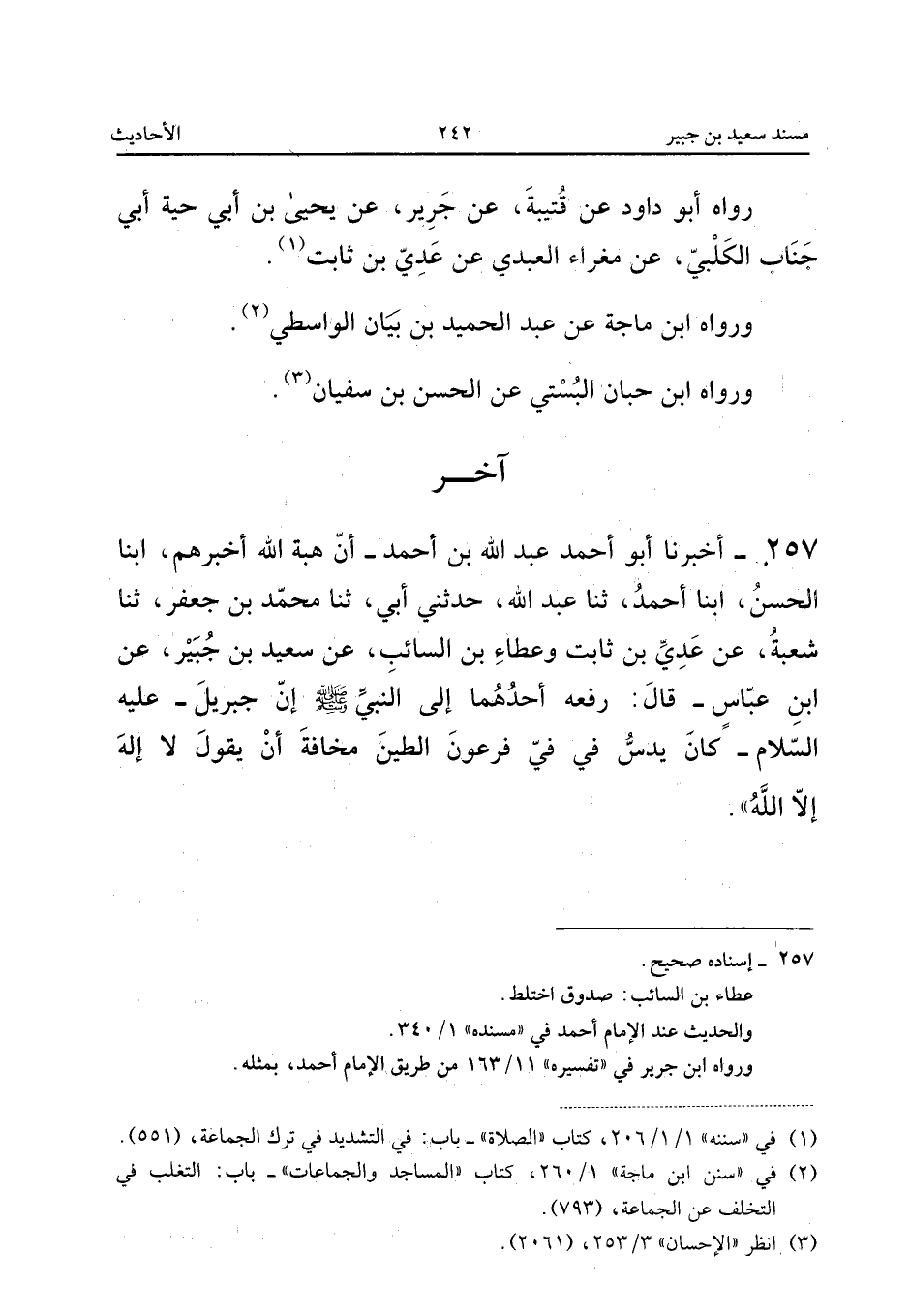 257 - أَخْبَرَنَا أَبُو أَحْمَدَ عَبْدُ اللَّهِ بْنُ أَحْمَدَ أَنَّ هِبَةَ اللَّهِ أَخْبَرَهُمْ أبنا الْحَسَنُ أبنا أَحْمَدُ ثَنَا عَبْدُ اللَّهِ حَدَّثَنِي أَبِي ثَنَا مُحَمَّدُ بْنُ جَعْفَرٍ ثَنَا شُعْبَةُ عَنْ عَدِيِّ بْنِ ثَابِتٍ وَعَطَاءِ بْنِ السَّائِبِ عَنْ سَعِيدِ بْنِ جُبَيْرٍ عَنِ ابْنِ عَبَّاسٍ قَالَ رَفَعَهُ أَحَدُهُمَا إِلَى النَّبِيِّ صَلَّى اللَّهُ عَلَيْهِ وَسَلَّمَ أَنَّ جِبْرِيلَ عَلَيْهِ السَّلامُ كَانَ يَدُسُّ فِي فِي فِرْعَوْنَ الطِّينَ مَخَافَةَ أَنْ يَقُولَ لَا إِلَهَ إِلا اللَّهُ