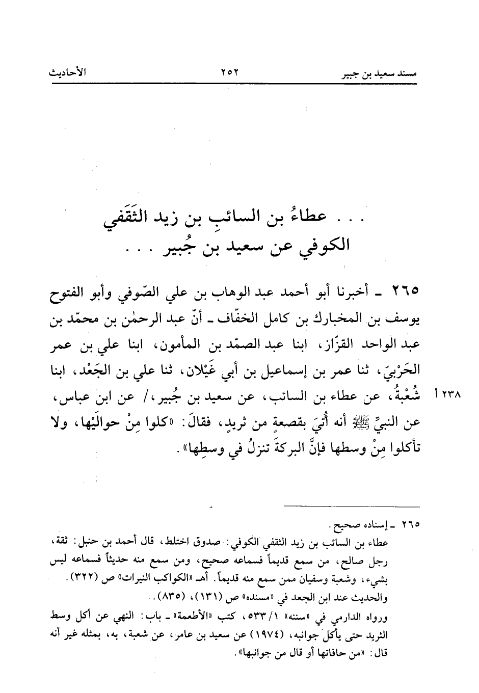 265 - أَخْبَرَنَا أَبُو أَحْمَدَ عَبْدُ الْوَهَّابِ بْنُ عَلِيٍّ الصُّوفِيُّ وَأَبُو الْفُتُوحِ يُوسُف بن المخبارك بْنِ كَامِلٍ الْخَفَّافُ أَنَّ عَبْدَ الرَّحْمَنِ بْنَ مُحَمَّدِ بْنِ عَبْدِ الْوَاحِدِ الْقَزَّازَ أبنا عَبْدُ الصَّمَدِ بْنُ الْمَأْمُونِ أبنا عَلِيُّ بْنُ عُمَرَ الْحَرْبِيُّ ثَنَا عُمَرُ بْنُ إِسْمَاعِيلَ بْنِ أَبِي غَيْلانَ ثَنا عَلِيُّ بْنُ الْجَعْدِ أبنا شُعْبَةُ عَنْ عَطَاءِ بْنِ السَّائِبِ عَنْ سَعِيدِ بْنِ جُبَيْرٍ عَنِ ابْنِ عَبَّاسٍ عَنِ النَّبِيِّ صَلَّى اللَّهُ عَلَيْهِ وَسَلَّمَ أَنَّهُ أُتِيَ بِقَصْعَةٍ مِنْ ثَرِيدٍ فَقَالَ كُلُوا مِنْ حَوَالَيْهَا وَلا تَأْكُلُوا مِنْ وَسَطِهَا فَإِنَّ الْبَرَكَةَ تَنْزِلُ فِي وَسَطِهَا