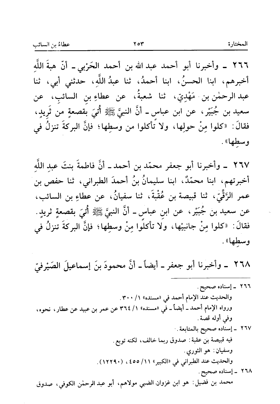 266 - وَأَخْبَرَنَا أَبُو أَحْمَدَ عَبْدُ اللَّهِ بْنُ أَحْمَدَ الْحَرْبِيُّ أَنَّ هِبَةَ اللَّهِ أَخْبَرَهُمْ أبنا الْحَسَنُ أبنا أَحْمَدُ ثَنَا عَبْدُ اللَّهِ حَدَّثَنِي أَبِي ثَنَا عَبْدُ الرَّحْمَنِ بْنُ مَهْدِيٍّ ثَنَا شُعْبَةُ عَنْ عَطَاءِ بْنِ السَّائِبِ عَنْ سَعِيدِ بْنِ جُبَيْرٍ عَنِ ابْنِ عَبَّاسٍ أَنَّ النَّبِيَّ صَلَّى اللَّهُ عَلَيْهِ وَسَلَّمَ أُتِيَ بِقَصْعَةٍ مِنْ ثَرَيدٍ فَقَالَ كُلُوا مِنْ حَوْلِهَا وَلا تَأْكُلُوا مِنْ وَسَطِهَا فَإِنَّ الْبَرَكَةَ تَنْزِلُ فِي وَسَطِهَا