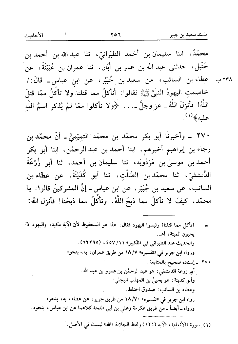 270 - وَأَخْبَرَنَا أَبُو بَكْرٍ مُحَمَّدُ بْنُ مُحَمَّدٍ التَّمِيمِيُّ أَنَّ مُحَمَّدَ بْنَ رَجَاءِ بْنِ إِبْرَاهِيمَ أَخْبَرَهُمْ أبنا أَحْمَدُ بْنُ عَبْدِ الرَّحْمَنِ أبنا أَبُو بَكْرٍ أَحْمَدُ بْنُ مُوسَى بْنِ مَرْدَوَيْهِ ثَنَا سُلَيْمَانُ بْنُ أَحْمَدَ ثَنَا أَبُو زُرْعَةَ الدِّمَشْقِيُّ ثَنَا مُحَمَّدُ بْنُ الصَّلْتِ ثَنَا أَبُو كُدَيْنَةَ عَنْ عَطَاءِ بْنِ السَّائِبِ عَنْ سَعِيدِ بْنِ جُبَيْرٍ عَنِ ابْنِ عَبَّاسٍ أَنَّ الْمُشْرِكِينَ قَالُوا يَا مُحَمَّدُ كَيْفَ لَا تَأْكُلُ مِمَّا ذَبَحَ اللَّهُ وَتَأْكُلُ مِمَّا ذَبَحْنَا فَأَنْزَلَ اللَّهُ {وَلا تَأْكُلُوا مِمَّا لَمْ يُذْكَرِ اسْمُ اللَّهِ عَلَيْهِ}