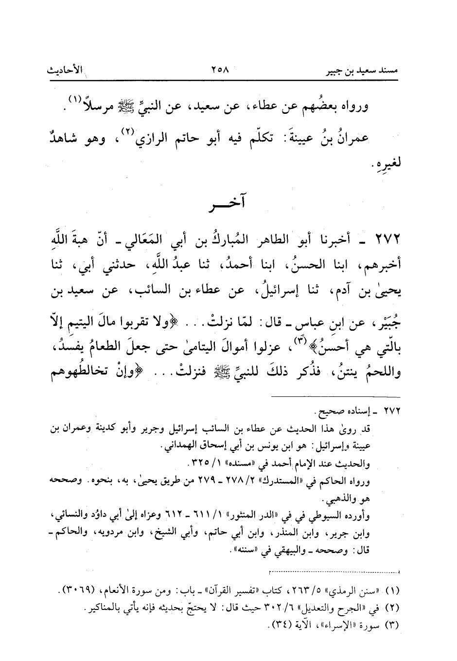 272 - أَخْبَرَنَا أَبُو الطَّاهِرِ الْمُبَارَكُ بْنُ أَبِي الْمَعَالِي أَنَّ هِبَةَ اللَّهِ أَخْبَرَهُمْ أبنا الْحَسَنُ أبنا أَحْمَدُ ثَنَا عَبْدُ اللَّهِ حَدَّثَنِي أَبِي ثَنَا يَحْيَى بْنُ آدَمَ ثَنَا اسرئيل عَنْ عَطَاءِ بْنِ السَّائِبِ عَنْ سَعِيدِ بْنِ جُبَيْرٍ عَنِ ابْنِ عَبَّاسٍ قَالَ لَمَّا نَزَلَتْ {وَلا تَقْرَبُوا مَالَ الْيَتِيمِ إِلا بِالَّتِي هِيَ أحسن} عَزَلُوا أَمْوَالَ الْيَتَامَى حَتَّى جَعَلَ الطَّعَامُ يَفْسَدُ وَاللَّحْمُ يَنْتَنُ فَذُكِرَ لِلنَّبِيِّ صَلَّى اللَّهُ عَلَيْهِ وَسَلَّمَ فَنَزَلَتْ {وَإِنْ تُخَالِطُوهُمْ}