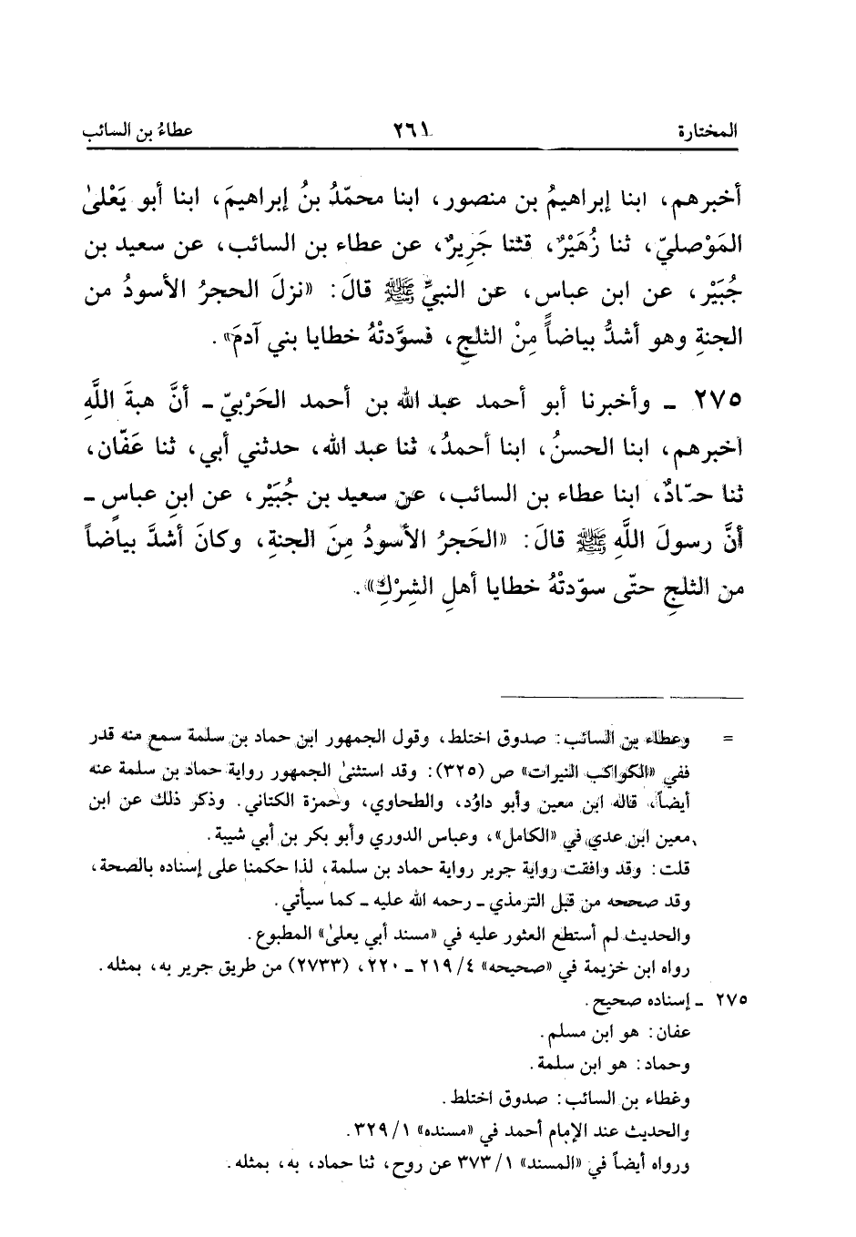 275 - وَأَخْبَرَنَا أَبُو أَحْمَدَ عَبْدُ اللَّهِ بْنُ أَحْمَدَ الْحَرْبِيُّ أَنَّ هِبَةَ اللَّهِ أَخْبَرَهُمْ أبنا الْحَسَنُ أبنا أَحْمَدُ ثَنَا عَبْدُ اللَّهِ حَدَّثَنِي أَبِي ثَنَا عَفَّانُ ثَنَا حَمَّادٌ أبنا عَطَاءُ بْنِ السَّائِبِ عَنْ سَعِيدِ بْنِ جُبَيْرٍ عَنِ ابْنِ عَبَّاسٍ أَنَّ رَسُولَ اللَّهِ صَلَّى اللَّهُ عَلَيْهِ وَسَلَّمَ قَالَ الْحَجَرُ الأَسْوَدُ مِنَ الْجَنَّةِ وَكَانَ أَشَدَّ بَيَاضًا مِنَ الثَّلْجِ حَتَّى سَوَّدَتْهُ خَطَايَا أَهْلِ الشِّرْكِ