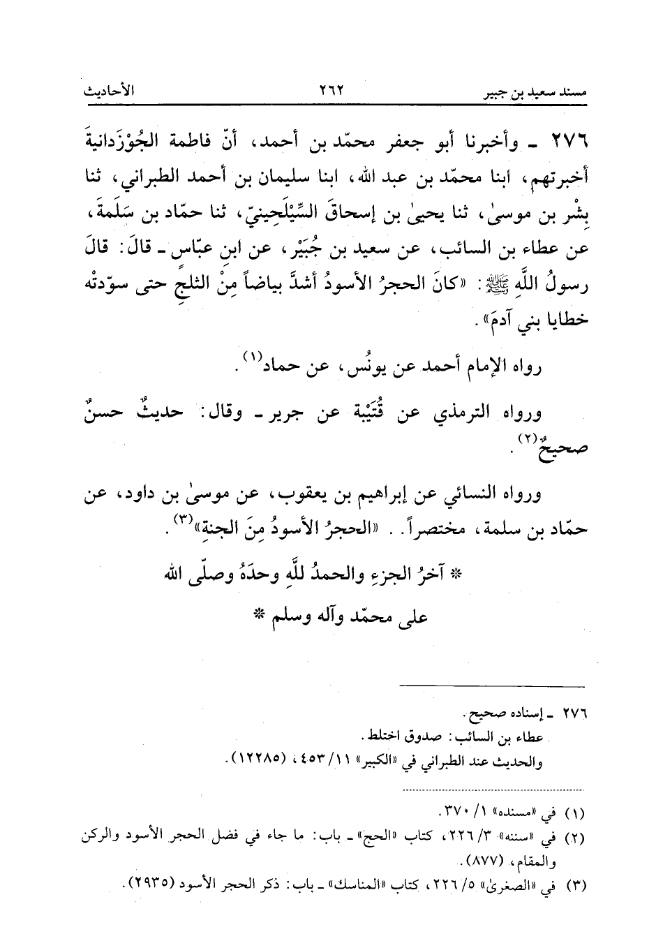 رَوَاهُ الإِمَامُ أَحْمَدُ عَنْ يُونُسَ عَنْ حَمَّادٍ وَرَوَاهُ التِّرْمِذِيُّ عَنْ قُتَيْبَةَ عَنْ جَرِيرٍ وَقَالَ حَدِيثٌ حَسَنٌ صَحِيحٌ وَرَوَاهُ النَّسَائِيُّ عَنْ إِبْرَاهِيمَ بْنِ يَعْقُوبَ عَنْ مُوسَى بْنِ دَاوُدَ عَنْ حَمَّادِ بْنِ سَلَمَةَ مُخْتَصَرًا الْحَجَرُ الأَسْوَدُ مِنَ الْجَنَّةِ آخِرُ الْجُزْءِ وَالْحَمْدُ لِلَّهِ وَحْدَهُ وَصَلَّى اللَّهُ عَلَى مُحَمَّدٍ وَآلِهِ وَسَلَّمَ