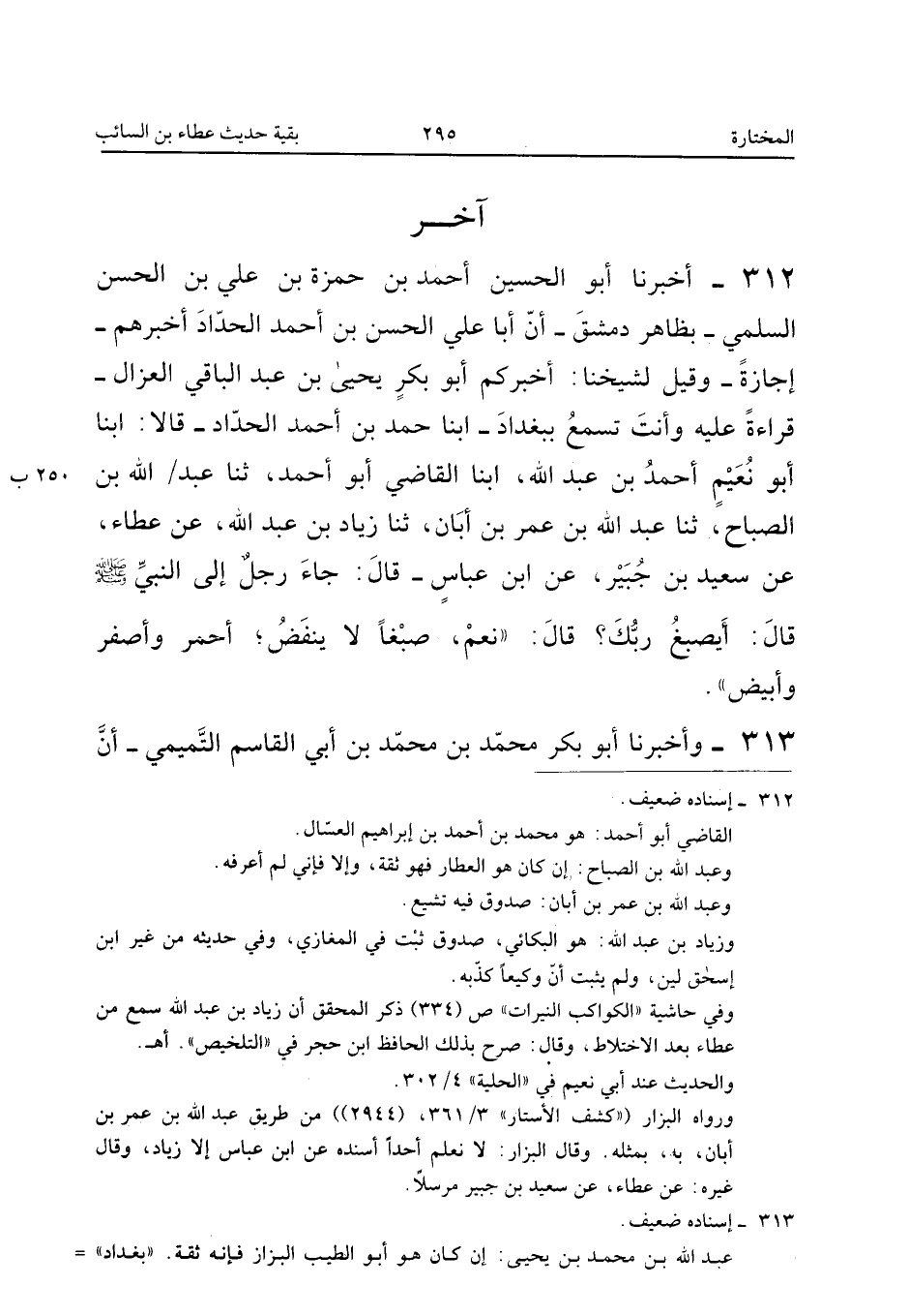 312 - أَخْبَرَنَا أَبُو الْحُسَيْنِ أَحْمَدُ بْنُ حَمْزَةَ بْنِ عَلِيِّ بْنِ الْحَسَنِ السُّلَمِيُّ بِظَاهِرِ دِمَشْقَ أَنَّ أَبَا عَلِيٍّ الْحَسَنَ بْنَ أَحْمَدَ الْحَدَّادَ أَخْبَرَهُمْ إِجَازَةً وَقِيلَ لِشَيْخِنَا أَخْبَرَكُمْ أَبُو بَكْرٍ يَحْيَى بْنُ عَبْدِ الْبَاقِي الْعَزَّالُ قِرَاءَةً عَلَيْهِ وَأَنْتَ تَسْمَعُ بِبَغْدَادَ أبنا حَمَدُ بْنُ أَحْمَدَ الْحَدَّادُ قَالا أبنا أَبُو نُعَيْمٍ أَحْمَدُ بْنُ عَبْدِ اللَّهِ أبنا الْقَاضِي أَبُو أَحْمَدَ ثَنَا عبد الله بْنُ الصَّبَّاحِ ثَنَا عَبْدُ اللَّهِ بْنُ عُمَرَ بْنِ أَبَانٍ ثَنَا زِيَادُ بْنُ عَبْدِ اللَّهِ عَنْ عَطَاءٍ عَنْ سَعِيدِ بْنِ جُبَيْرٍ عَنِ ابْنِ عَبَّاسٍ قَالَ جَاءَ رَجُلٌ إِلَى النَّبِيِّ صَلَّى اللَّهُ عَلَيْهِ وَسَلَّمَ قَالَ أَيَصْبِغُ رَبُّكَ قَالَ نَعَمْ صَبْغًا لَا يَنْفَضُّ أَحْمَرُ وَأَصْفَرُ وَأَبْيَضُ