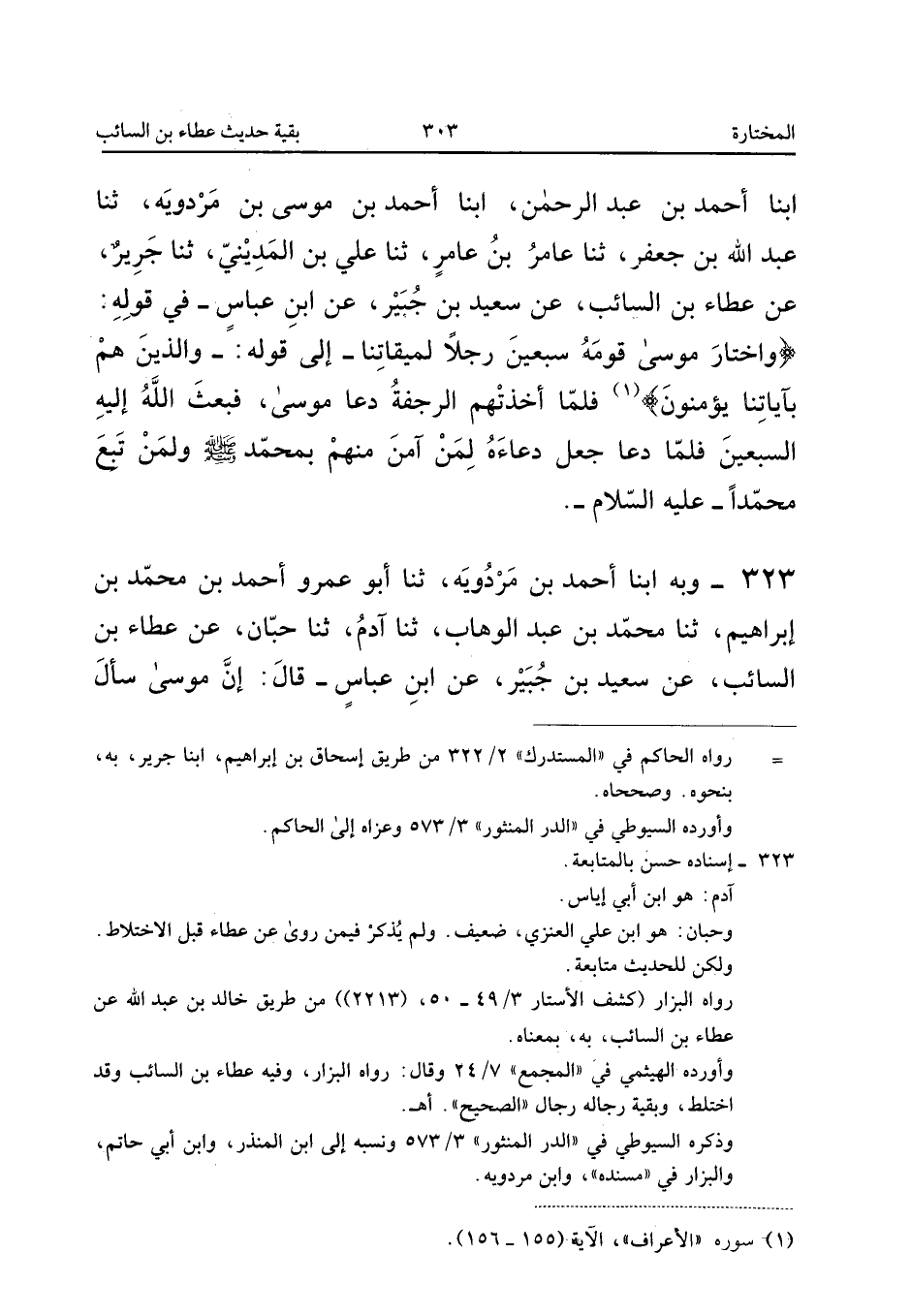 323 - وَبِهِ أبنا أَحْمَدُ بْنُ مَرْدَوَيْهِ ثَنَا أَبُو عَمْرٍو أَحْمَدُ بْنُ مُحَمَّدِ بْنِ إِبْرَاهِيمَ ثَنَا مُحَمَّدُ بْنُ عَبْدِ الْوَهَّابِ ثَنَا آدَمُ ثَنا حِبَّانُ عَنْ عَطَاءِ بْنِ السَّائِبِ عَنْ سَعِيدِ بْنِ جُبَيْرٍ عَنِ ابْنِ عَبَّاسٍ قَالَ إِنَّ مُوسَى سَأَلَ رَبَّهُ مَسْأَلَةً فَأَعْطَى اللَّهُ مُحَمَّدًا عَلَيْهِ السَّلامُ أَنَّهُ لَمَّا احْتَرَقَ السَّبْعُونَ قَالَ مُوسَى عَلَيْهِ السَّلامُ {لَوْ شِئْتَ أَهْلَكْتَهُمْ مِنْ قَبْلُ وَإِيَّايَ أتهلكنا} إِلَى قَوْلِهِ {وَاكْتُبْ لَنَا فِي هَذِهِ الدُّنْيَا حَسَنَة وَفِي الْآخِرَة} فَأَعْطَاهَا الله مُحَمَّدًا ص