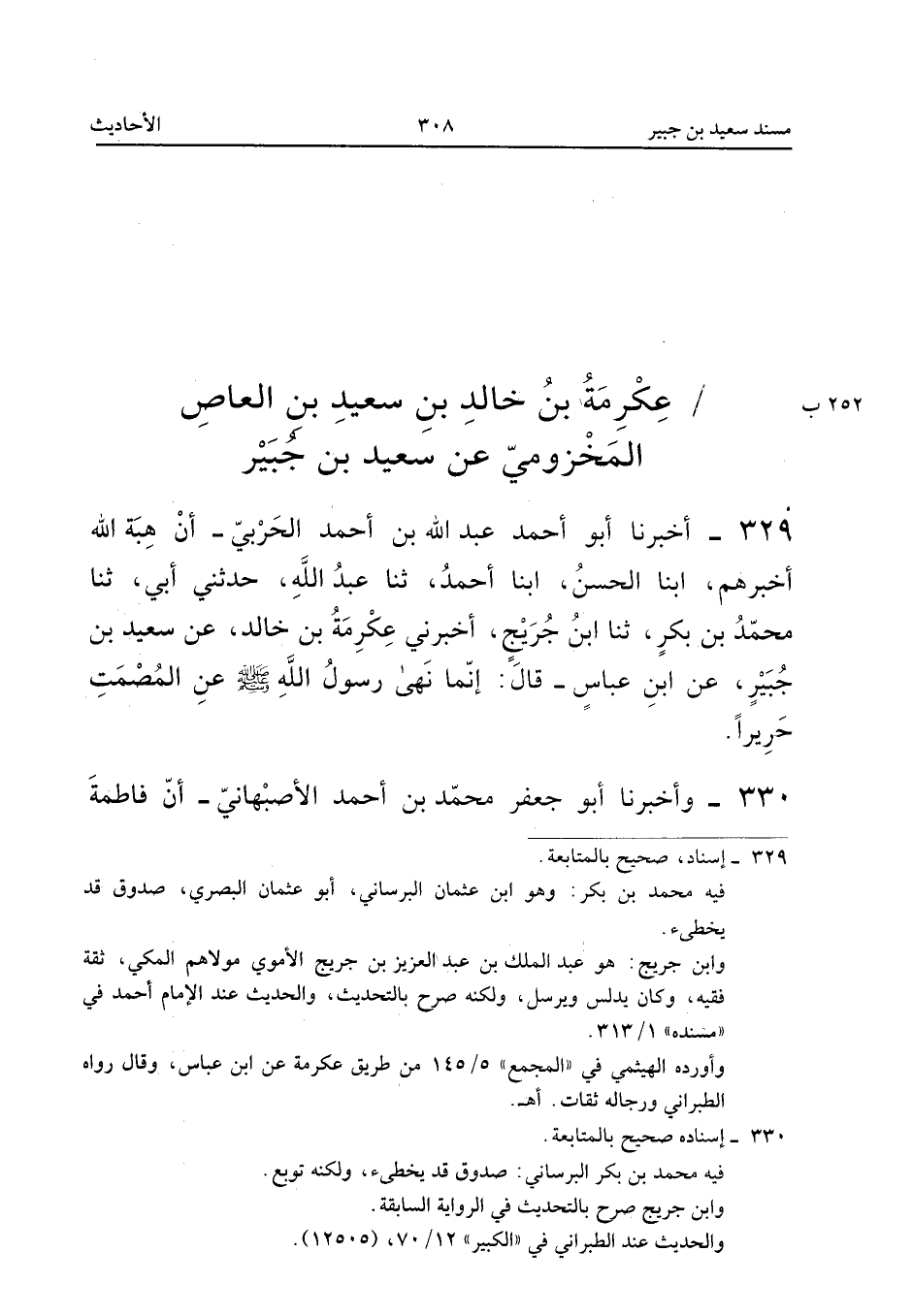 330 - وَأَخْبَرَنَا أَبُو جَعْفَرٍ مُحَمَّدُ بْنُ أَحْمَدَ الأَصْبَهَانِيُّ أَنَّ فَاطِمَةَ الْجَوْزَدَانِيَّةَ أَخْبَرَتْهُمْ أبنا مُحَمَّدُ بْنُ عَبْدِ اللَّهِ أبنا سُلَيْمَانُ بْنُ أَحْمَدَ الطَّبَرَانِيُّ ثَنَا مُوسَى بْنُ هَارُونَ ثَنَا أَبِي ثَنَا مُحَمَّدُ بْنُ بَكْرٍ الْبُرْسَانِيُّ ثَنَا ابْنُ جُرَيْجٍ عَنْ عِكْرِمَةَ بْنِ خَالِدٍ عَنْ سَعِيدِ بْنِ جُبَيْرٍ عَنِ ابْنِ عَبَّاسٍ قَالَ نَهَى رَسُولُ الله ص