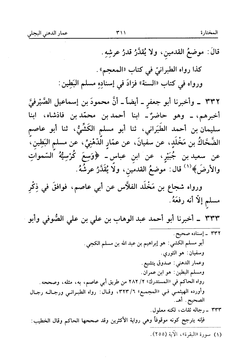 332 - وَأَخْبَرَنَا أَبُو جَعْفَرٍ أَيْضًا أَنَّ مَحْمُودَ بْنَ إِسْمَاعِيلَ الصَّيْرَفِيَّ أَخْبَرَهُمْ وَهُوَ حَاضِرٌ أَبنا أَحْمَدُ بْنُ مُحَمَّدِ بْنِ فَاذْشَاهْ أبنا سُلَيْمَانُ بْنُ أَحْمَدَ الطَّبَرَانِيُّ ثَنَا أَبُو مُسْلِمٍ الْكَشِّيُّ ثَنَا أَبُو عَاصِمٍ الضَّحَّاكُ بْنُ مَخْلَدٍ عَنْ سُفْيَانَ عَنْ عَمَّارٍ الدُّهْنِيِّ عَنْ مُسْلِمٍ الْبَطِينِ عَنْ سَعِيدِ بْنِ جُبَيْرٍ عَنِ ابْنِ عَبَّاسٍ {وَسِعَ كرسيه السَّمَاوَات وَالْأَرْض} قَالَ مَوْضِعَ الْقَدَمَيْنِ وَلا يُقْدَرُ عَرْشُهُ