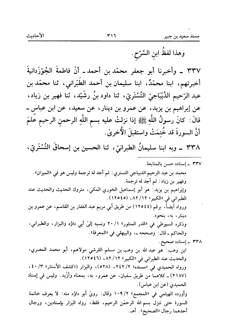 337 - وَأَخْبَرَنَا أَبُو جَعْفَرٍ مُحَمَّدُ بْنُ أَحْمَدَ أَنَّ فَاطِمَةَ الْجَوْزَدَانِيَّةَ أَخْبَرَتْهُمْ أبنا مُحَمَّدٌ أبنا سُلَيْمَانُ بْنُ أَحْمَدَ الطَّبَرَانِيُّ ثَنَا مُحَمَّدُ بْنُ عَبْدِ الرَّحِيمِ الدِّيبَاجِيُّ التُّسْتَرِيُّ ثَنَا دَاوُدُ بْنُ رُشَيْدٍ ثَنَا فُهَيْرُ بْنُ زِيَادٍ عَنْ إِبْرَاهِيمَ بْنِ يَزِيدَ عَنْ عَمْرِو بْنِ دِينَارٍ عَنْ سَعِيدٍ عَنِ ابْنِ عَبَّاسٍ قَالَ كَانَ رَسُولُ اللَّهِ صَلَّى اللَّهُ عَلَيْهِ وَسَلَّمَ إِذَا نَزَلَتْ عَلَيْهِ بِسْمِ اللَّهِ الرَّحْمَنِ الرَّحِيمِ عَلِمَ أَنَّ السُّورَةَ قَدْ خُتِمَتْ وَاسْتَقْبَلَ الأُخْرَى
