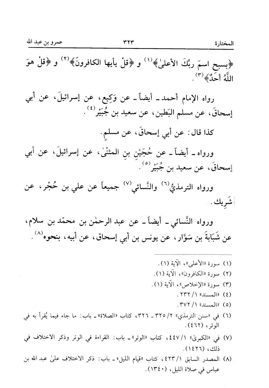 رَوَاهُ الإِمَامُ أَحْمَدُ أَيْضًا عَنْ وَكِيعٍ عَنْ إِسْرَائِيلَ عَنْ أَبِي إِسْحَاقَ عَنْ مُسْلِمٍ الْبَطِينِ عَنْ سَعِيدِ بْنِ جُبَيْرٍ كَذَا قَالَ عَنْ أَبِي إِسْحَاقَ عَنْ مُسْلِمٍ وَرَوَاهُ أَيْضًا عَنْ حُجَيْنِ بْنِ الْمُثَنَّى عَنْ إِسْرَائِيلَ عَنْ أَبِي إِسْحَاقَ عَنْ سَعِيدِ بْنِ جُبَيْرٍ وَرَوَاهُ التِّرْمِذِيُّ وَالنَّسَائِيُّ جَمِيعًا عَنْ عَلِيِّ بْنِ حَجَرٍ عَنْ شَرِيكٍ وَرَوَاهُ النَّسَائِيُّ أَيْضًا عَنْ عَبْدِ الرَّحْمَنِ بْنِ مُحَمَّدِ بْنِ سَلامٍ عَنْ شَبَابَةَ بْنِ سَوَّارٍ عَنْ يُونُسَ بْنِ أَبِي إِسْحَاقَ عَنْ أَبِيه بِنَحْوِهِ