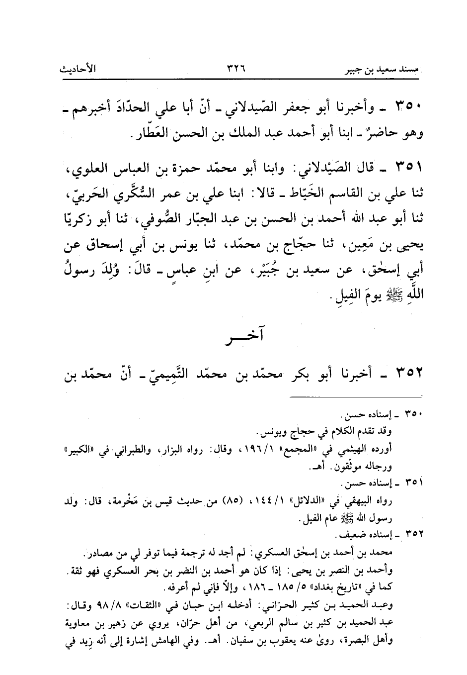 351 - قَالَ الصَّيْدَلانِيُّ وَأبنا أَبُو مُحَمَّدٍ حَمْزَةُ بْنُ الْعَبَّاسِ الْعَلَوِيُّ ثَنَا عَلِيُّ بْنُ الْقَاسِمِ الْخَيَّاطُ قَالا أبنا عَلِيُّ بْنُ عُمَرَ السُّكَّرِيُّ الْحَرْبِيُّ ثَنَا أَبُو عَبْدِ اللَّهِ أَحْمَدُ بْنُ الْحَسَنِ بْنِ عَبْدِ الْجَبَّارِ الصُّوفِيُّ ثَنَا أَبُو زَكَرِيَّا يَحْيَى بْنُ مَعِينٍ ثَنَا حَجَّاجُ بْنُ مُحَمَّدٍ ثَنَا يُونُسُ بن أبي اسحاق عَن أبي اسحق عَنْ سَعِيدِ بْنِ جُبَيْرٍ عَنِ ابْنِ عَبَّاسٍ قَالَ وُلِدَ رَسُولُ اللَّهِ صَلَّى اللَّهُ عَلَيْهِ وَسَلَّمَ يَوْمَ الْفِيلِ