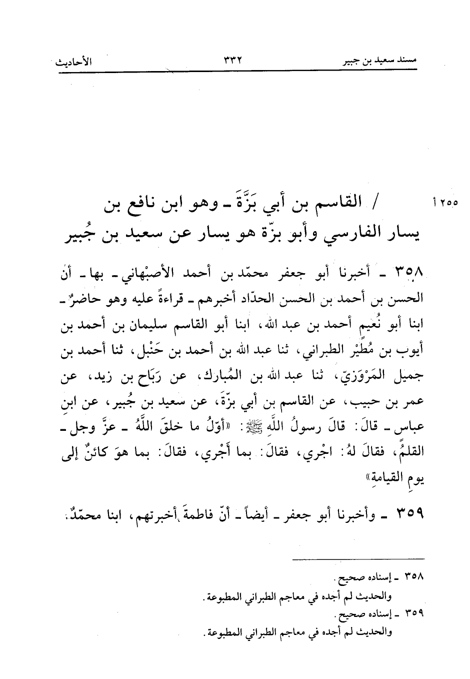 358 - أَخْبَرَنَا أَبُو جَعْفَرٍ مُحَمَّدُ بْنُ أَحْمَدَ الأَصْبَهَانِيُّ بِهَا أَنَّ الْحَسَنَ بْنَ أَحْمَدَ بْنِ الْحَسَنِ الْحَدَّادَ أَخْبَرَهُمْ قِرَاءَةً عَلَيْهِ وَهُوَ حَاضِرٌ أبنا أَبُو نُعَيْمٍ أَحْمَدُ بْنُ عَبْدِ اللَّهِ أبنا أَبُو الْقَاسِمِ سُلَيْمَانُ بْنُ أَحْمَدَ بْنِ أَيُّوبَ بْنِ مُطَيْرٍ الطَّبَرَانِيُّ ثَنَا عَبْدُ اللَّهِ بْنُ أَحْمَدَ بْنِ حَنْبَلٍ ثَنَا أَحْمَدُ بْنُ جَمِيلٍ الْمَرْوَزِيُّ ثَنَا عَبْدُ اللَّهِ بْنُ الْمُبَارَكِ عَنْ رَبَاحِ بْنِ زَيْدٍ عَنْ عُمَرَ بْنِ حَبِيبٍ عَنِ الْقَاسِمِ بْنِ أَبِي بَزَّةَ عَنْ سَعِيدِ بْنِ جُبَيْرٍ عَنِ ابْنِ عَبَّاسٍ قَالَ قَالَ رَسُولُ اللَّهِ صَلَّى الله عَلَيْهِ وَسلم أول ماخلق الله عز وَجل الْقَلَم فَقَالَ لَهُ اجري فَقَالَ بِمَا أَجْرِي فَقَالَ بِمَا هُوَ كَائِنٌ إِلَى يَوْمِ الْقِيَامَةِ