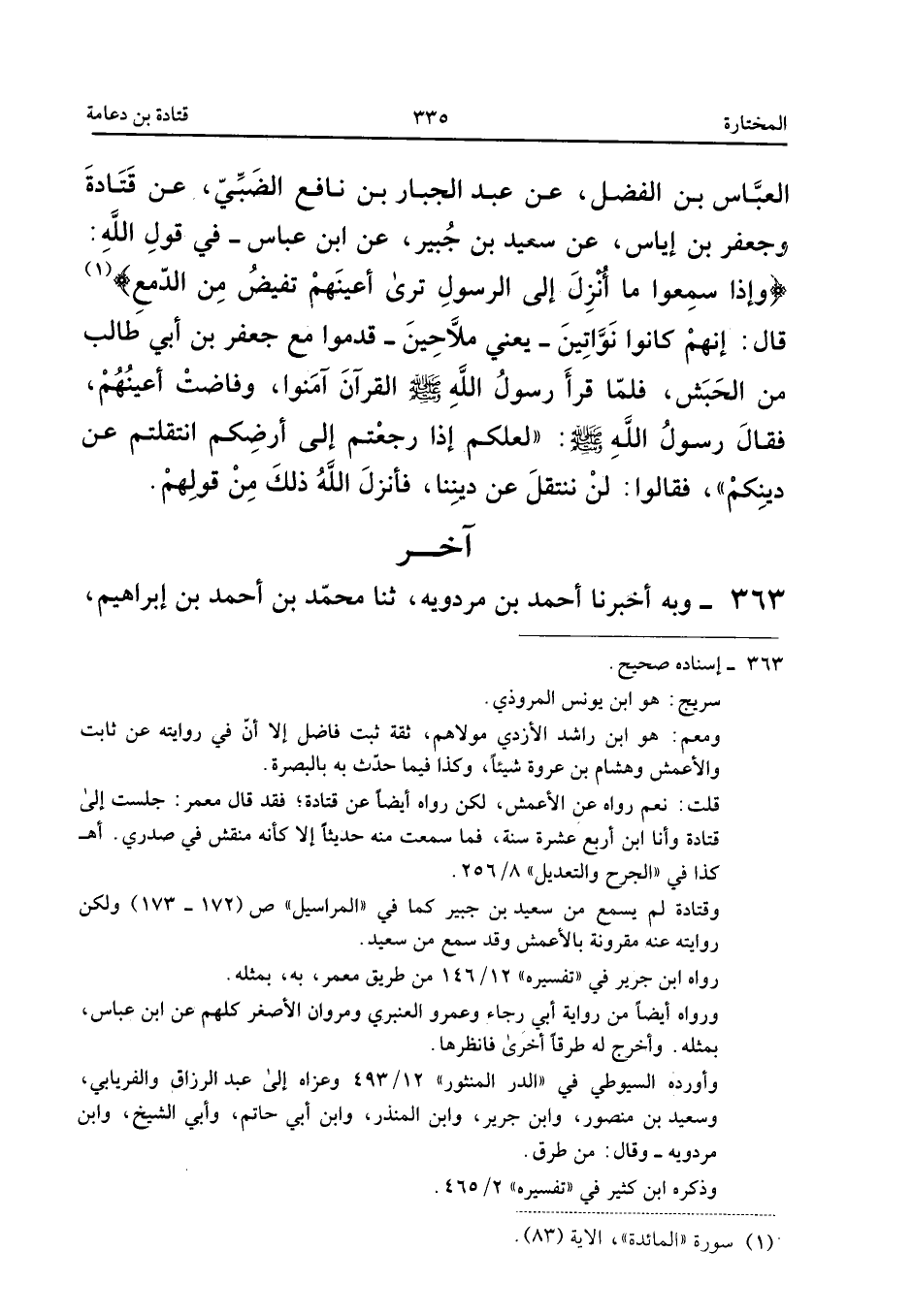 363 - وَبِهِ أَخْبَرَنَا أَحْمَدُ بْنُ مَرْدَوَيْهِ ثَنَا مُحَمَّدُ بْنُ أَحْمَدَ بْنِ إِبْرَاهِيمَ ثَنَا حَامِدُ بْنُ شُعَيْبٍ ثَنَا سُرَيْجٌ ثَنَا أَبُو سُفْيَانَ عَنْ مَعْمَرٍ عَنْ قَتَادَةَ وَالأَعْمَشِ عَنْ سَعِيدِ بْنِ جُبَيْرٍ عَنِ ابْنِ عَبَّاسٍ {وَجَاءَكَ فِي هَذِه الْحق} قَالا فِي هَذِهِ السُّورَةِ