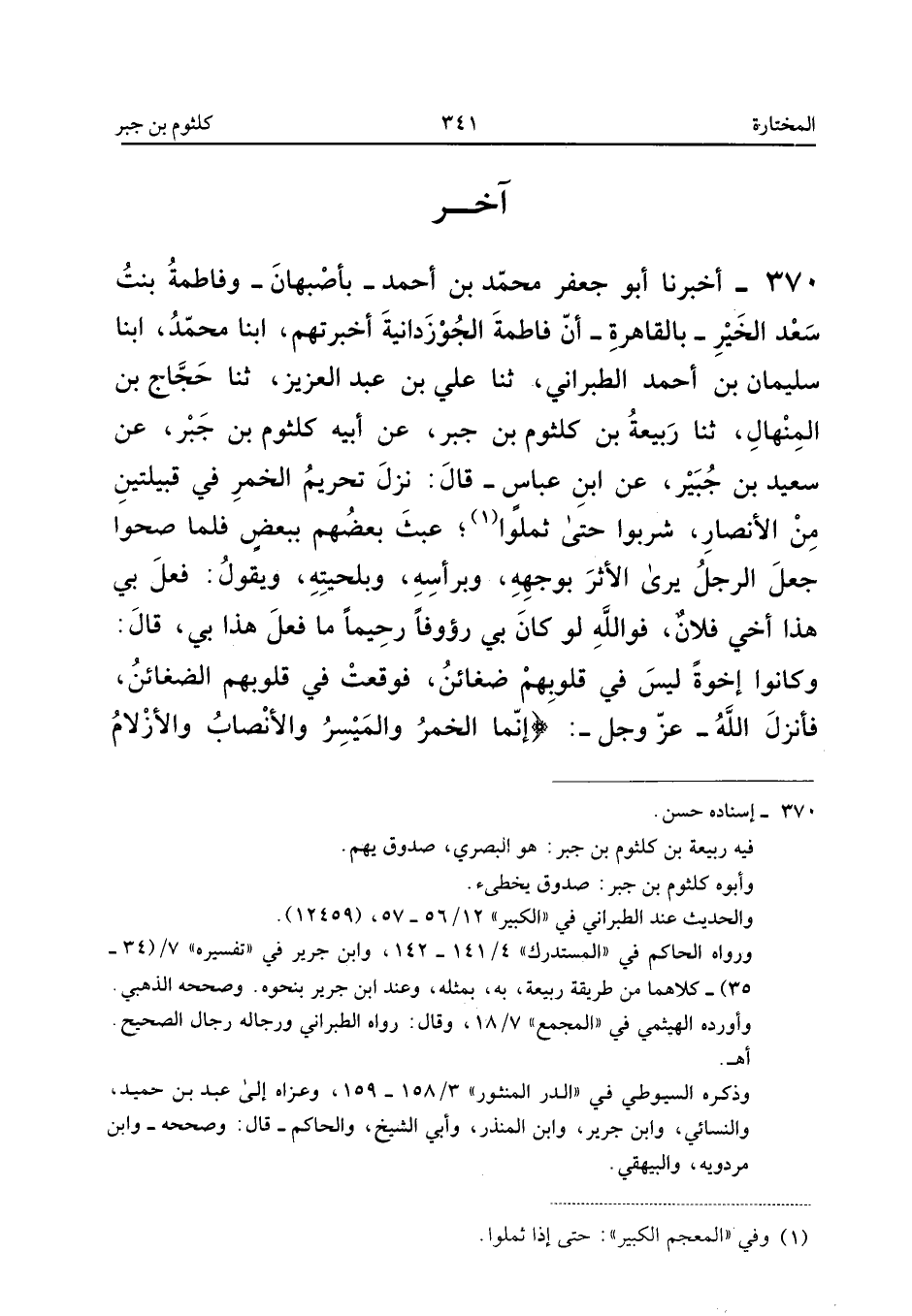 370 - أَخْبَرَنَا أَبُو جَعْفَرٍ مُحَمَّدُ بْنُ أَحْمَدَ بِأَصْبَهَانَ وَفَاطِمَةُ بِنْتُ سَعْدِ الْخَيْرِ بِالْقَاهِرَةِ أَنَّ فَاطِمَةَ الْجَوْزَدَانِيَّةَ أَخْبَرَتْهُمْ أبنا مُحَمَّدٌ أبنا سُلَيْمَانُ بن أمد الطَّبَرَانِيُّ ثَنَا عَلِيُّ بْنُ عَبْدِ الْعَزِيزِ ثَنا حَجَّاجُ بْنُ الْمِنْهَالِ ثَنَا رَبِيعَةُ بْنُ كُلْثُومِ بْنِ جَبْرٍ عَنْ أَبِيهِ كُلْثُومِ بْنِ جَبْرٍ عَنْ سَعِيدِ بْنِ جُبَيْرٍ عَنِ ابْنِ عَبَّاسٍ قَالَ نَزَلَ تَحْرِيمُ الْخَمْرِ فِي قَبِيلَتَيْنِ مِنَ الأَنْصَارِ شَرِبُوا حَتَّى ثَمِلُوا عَبَثَ بَعْضُهُمْ بِبَعْضٍ فَلَمَّا صَحَوْا جَعَلَ الرَّجُلُ يَرَى الأَثَرَ بِوَجْهِهِ وَبِرَأْسِهِ وَبِلِحْيَتِهِ وَيَقُولُ فَعَلَ بِي هَذَا أَخِي فلَان فوَاللَّه لَو كَانَ بِي رؤوفا رَحِيمًا مَا فَعَلَ هَذَا بِي قَالَ وَكَانُوا أُخْوَةً لَيْسَ فِي قُلُوبِهِمْ ضَغَائِنُ فَوَقَعَتْ فِي قُلُوبِهِمُ الضَّغَائِنُ فَأَنْزَلَ اللَّهُ عَزَّ وَجَلَّ {إِنَّمَا الْخَمْرُ وَالْمَيْسِرُ وَالأَنْصَابُ وَالأَزْلامُ}