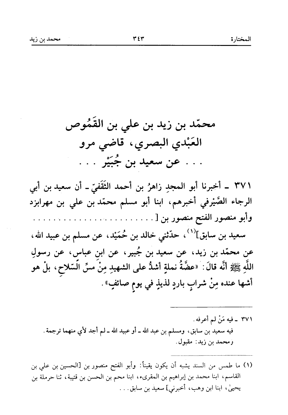 371 - أَخْبَرَنَا أَبُو الْمَجْدِ زَاهِرُ بْنُ أَحْمَدَ الثَّقَفِيُّ أَنَّ سَعِيدَ بْنَ أَبِي الرَّجَاءِ الصَّيْرَفِيَّ أَخْبَرَهُمْ أبنا أَبُو مُسْلِمٍ مُحَمَّدُ بْنُ عَلِيِّ بن مهرابزد وَأَبُو مَنْصُور الْفَتْح مَنْصُور بن [سَعِيد بْن سَابِقٍ] حَدَّثَنِي خَالِدُ بْنُ حُمَيْدٍ عَن مُسلم بن عبيد الله عَن مُحَمَّدِ بْنِ زَيْدٍ عَنْ سَعِيدِ بْنِ جُبَيْرٍ عَنِ ابْنِ عَبَّاسٍ عَنْ رَسُولِ اللَّهِ صَلَّى اللَّهُ عَلَيْهِ وَسَلَّمَ أَنَّهُ قَالَ عَضَّةُ نَمْلَةٍ أَشَدُّ عَلَى الشَّهِيدِ مِنْ مَسِّ السِّلاحِ بَلْ هُوَ أشها عِنْدَهُ مِنْ شَرَابٍ بَارِدٍ لَذِيذٍ فِي يَوْمٍ صَائِف