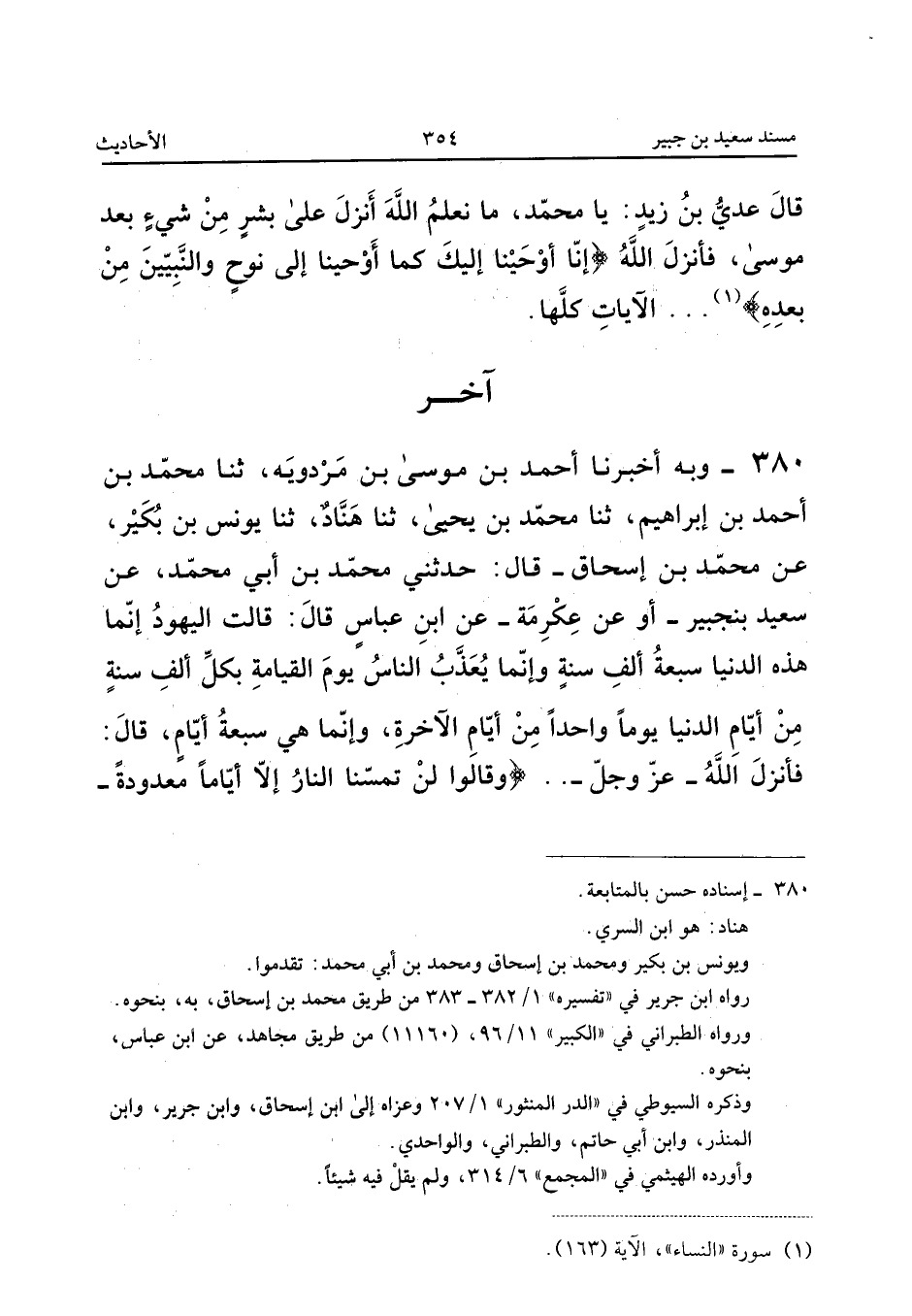 380 - وَبِهِ أَخْبَرَنَا أَحْمَدُ بْنُ مُوسَى بْنِ مَرْدَوَيْهِ ثَنَا مُحَمَّدُ بْنُ أَحْمَدَ بْنِ إِبْرَاهِيمَ ثَنَا مُحَمَّدُ بْنُ يَحْيَى ثَنَا هَنَّادٌ ثَنَا يُونُسُ بْنُ بُكَيْرٍ عَنْ مُحَمَّدِ بْنِ إِسْحَاقَ قَالَ حَدَّثَنِي مُحَمَّدُ بْنُ أَبِي مُحَمَّدٍ عَنْ سَعِيدِ بْنِ جُبَيْرٍ أَوْ عَنْ عِكْرِمَةَ عَنِ ابْنِ عَبَّاسٍ قَالَ قَالَتِ الْيَهُودُ إِنَّمَا هَذِهِ الدُّنْيَا سَبْعَةُ أَلْفِ سَنَةٍ وَإِنَّمَا يُعَذَّبُ النَّاسُ يَوْمَ الْقِيَامَةِ بِكُلِّ أَلْفِ سَنَةٍ مِنْ أَيَّامِ الدُّنْيَا يَوْمًا وَاحِدًا مِنْ أَيَّامِ الآخِرَةِ وَإِنَّمَا هِيَ سَبْعَةُ أَيَّامٍ قَالَ فَأَنْزَلَ اللَّهُ عَزَّ وَجَلَّ {وَقَالُوا لَنْ تَمَسَّنَا النَّارُ إِلا أَيَّامًا مَعْدُودَة} حَتَّى بلغ {خَالدُونَ} فَأَخْبَرَهُمُ اللَّهُ أَنَّ الثَّوَابَ فِي الْخَيْرِ وَالشَّرِّ مُقيم أبدا