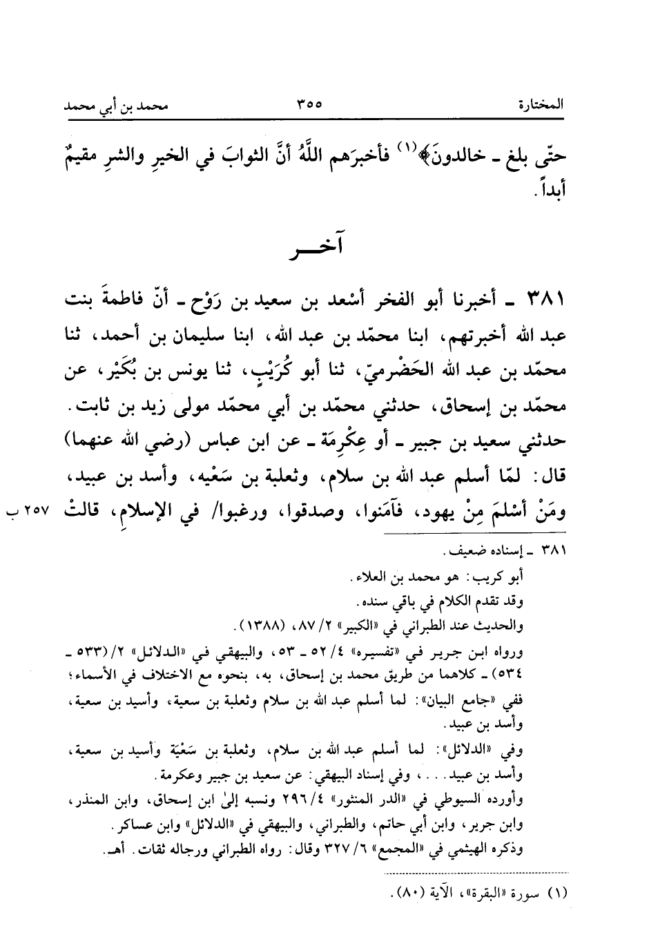 381 - أَخْبَرَنَا أَبُو الْفَخْرِ أَسْعَدُ بْنُ سَعِيدِ بْنِ رَوْحٍ أَنَّ فَاطِمَةَ بِنْتَ عَبْدِ اللَّهِ أَخْبَرَتْهُمْ أبنا مُحَمَّدُ بْنُ عَبْدِ اللَّهِ أبنا سُلَيْمَانُ بْنُ أَحْمَدَ ثَنَا مُحَمَّدُ بْنُ عَبْدِ اللَّهِ الْحَضْرَمِيُّ ثَنَا أَبُو كُرَيْبٍ ثَنَا يُونُسُ بْنُ بُكَيْرٍ عَنْ مُحَمَّدِ بْنِ إِسْحَاقَ حَدَّثَنِي مُحَمَّدُ بْنُ أَبِي مُحَمَّدٍ مَوْلَى زَيْدِ بْنِ ثَابِتٍ حَدَّثَنِي سَعِيدُ بْنُ جُبَيْرٍ أَوْ عِكْرِمَةُ عَنِ ابْنِ عَبَّاسٍ (رَضِيَ اللَّهُ عَنْهُمَا) قَالَ لَمَّا أَسْلَمَ عَبْدُ اللَّهِ بْنُ سَلامٍ وَثَعْلَبَةُ بْنُ سَعْيَةَ وَأَسَدُ بْنُ عُبَيْدٍ وَمَنْ أَسْلَمَ مِنْ يَهُودَ فَآمَنُوا وَصَدَّقُوا وَرَغِبُوا فِي الإِسْلامِ قَالَت