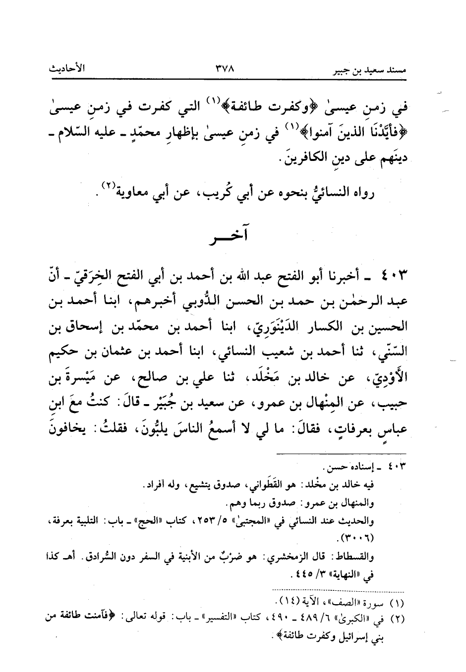 403 - أَخْبَرَنَا أَبُو الْفَتْحِ عَبْدُ اللَّهِ بْنُ أَحْمَدَ بْنِ أَبِي الْفَتْحِ الْخَرَقِيُّ أَنَّ عَبْدَ الرَّحْمَنِ بن حمد بن الْحسن الدوبي أَخْبَرَهُمْ أبنا أَحْمَدُ بْنُ الْحُسَيْنِ بْنِ الْكَسَّارِ الدِّينَوَرِيُّ أبنا أَحْمَدُ بْنُ مُحَمَّدِ بْنِ إِسْحَاقَ بْنِ السُّنِّيِّ ثَنَا أَحْمَدُ بْنُ شُعَيْبٍ النَّسَائِيُّ أبنا أَحْمَدُ بْنُ عُثْمَانَ بْنِ حَكِيمٍ الأَوْدِيُّ عَنْ خَالِدِ بْنِ مُخَلَّدٍ ثَنَا عَلِيُّ بْنُ صَالِحٍ عَنْ مَيْسَرَةَ بْنِ حَبِيبٍ عَنِ الْمِنْهَالِ بْنِ عَمْرٍو عَنْ سَعِيدِ بْنِ جُبَيْرٍ قَالَ كُنْتُ مَعَ ابْنِ عَبَّاسٍ بِعَرَفَاتٍ فَقَالَ مَا لِي لَا أَسْمَعُ النَّاسَ يُلَبُّونَ فَقُلْتُ يَخَافُونَ مِنْ مُعَاوِيَةَ فَخَرَجَ ابْنُ عَبَّاسٍ مِنْ فُسْطَاطِهِ فَقَالَ لَبَّيْكَ اللَّهُمَّ لَبَّيْكَ لَبَّيْكَ فَإِنَّهُمْ قَدْ تَرَكُوا السُّنَّةَ مِنْ بُغْضِ عَلِيٍّ